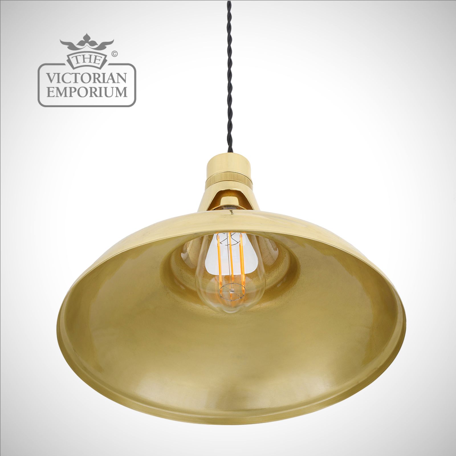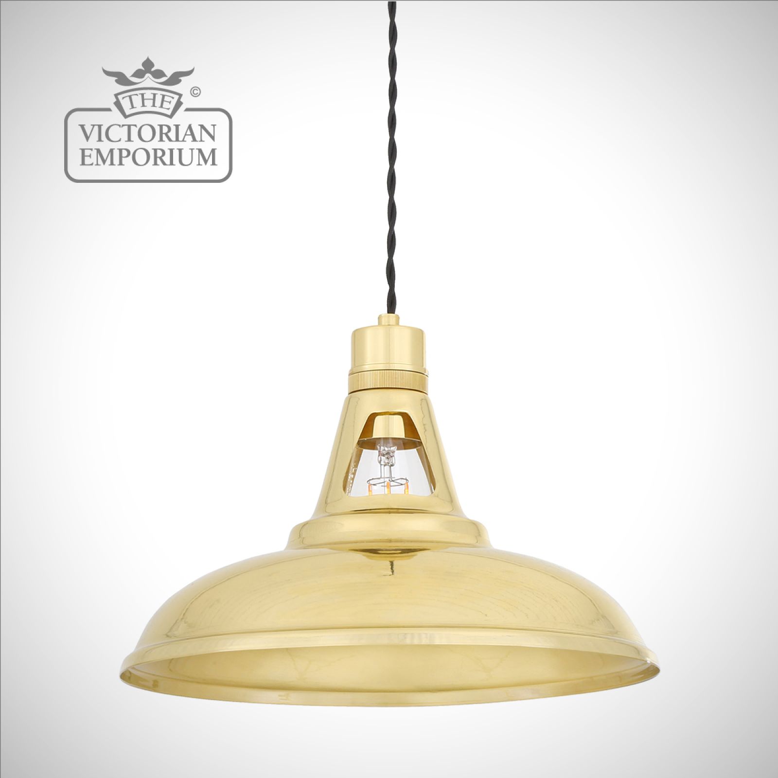 The circular brass shade provides a generous task light and looks great when lit with an Edison Teardrop Bulb for a soft lighting. Bulbs are sold separately.