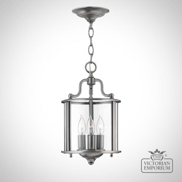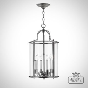 The Gentry’s medium pendant is a traditional design in Olde Bronze, Pewter and Polished Solid Brass finishes. The clear bent glass panels, white candle sleeves and coordinating candle chasers add classic elegance to this design