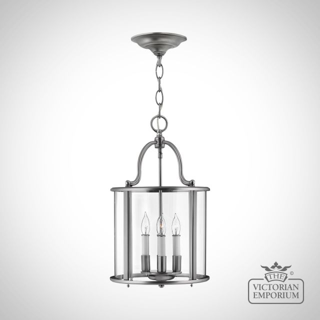 The Gentry’s medium pendant is a traditional design in Olde Bronze, Pewter and Polished Solid Brass finishes. The clear bent glass panels, white candle sleeves and coordinating candle chasers add classic elegance to this design