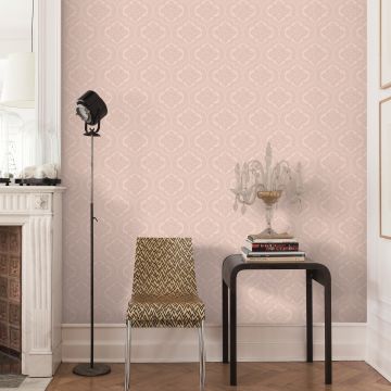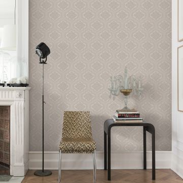 A hand drawn geometric flower design in a range of muted colours. This design would be suitable for a reception room or feature wall. In a choice of beige, pink, dark grey and pale grey.