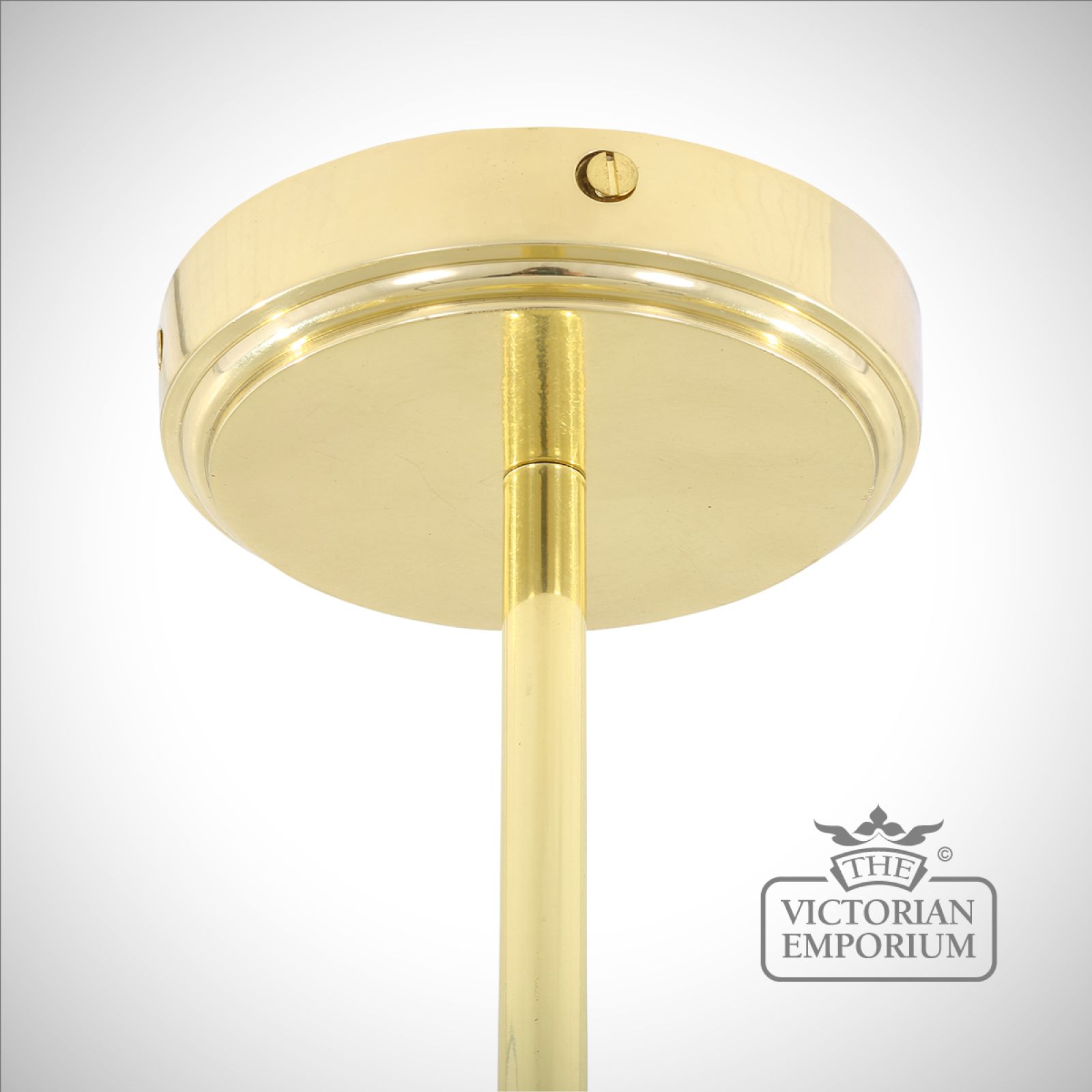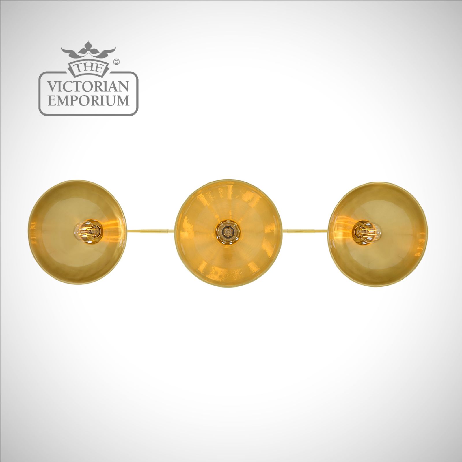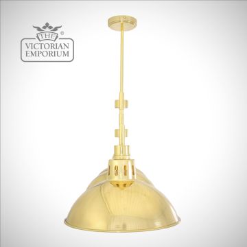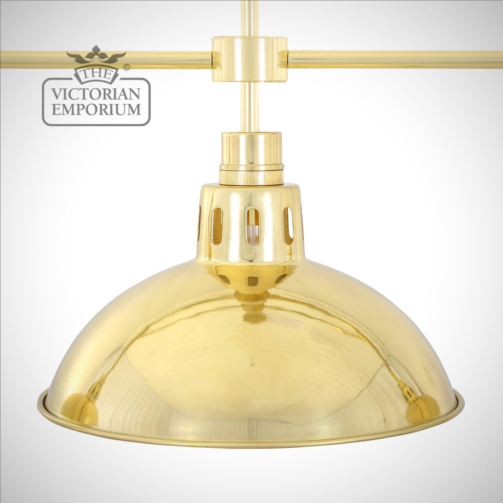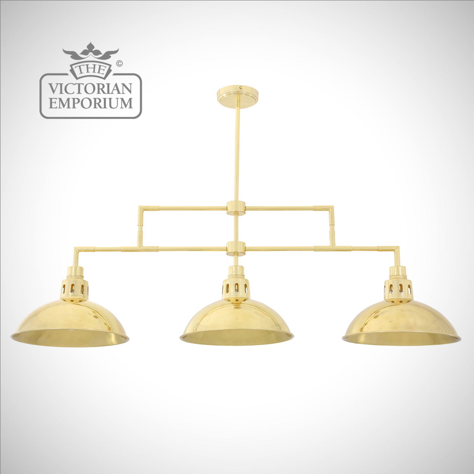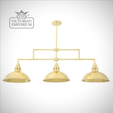 The Georgia is a large, industrial bar pendant ideal for use over kitchen islands or dining areas or even over a pool table. It features three industrial-style brass shades attached to a brass bar.