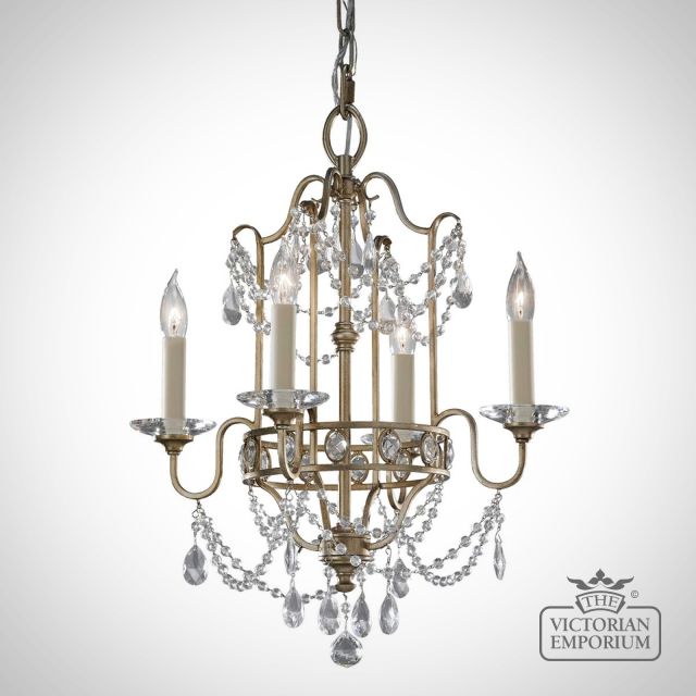 With influence from elegant Italian interiors of the 1900's, the Gianne 4 light chandelier features delicate crystals with a hand painted Gilded Silver finish.