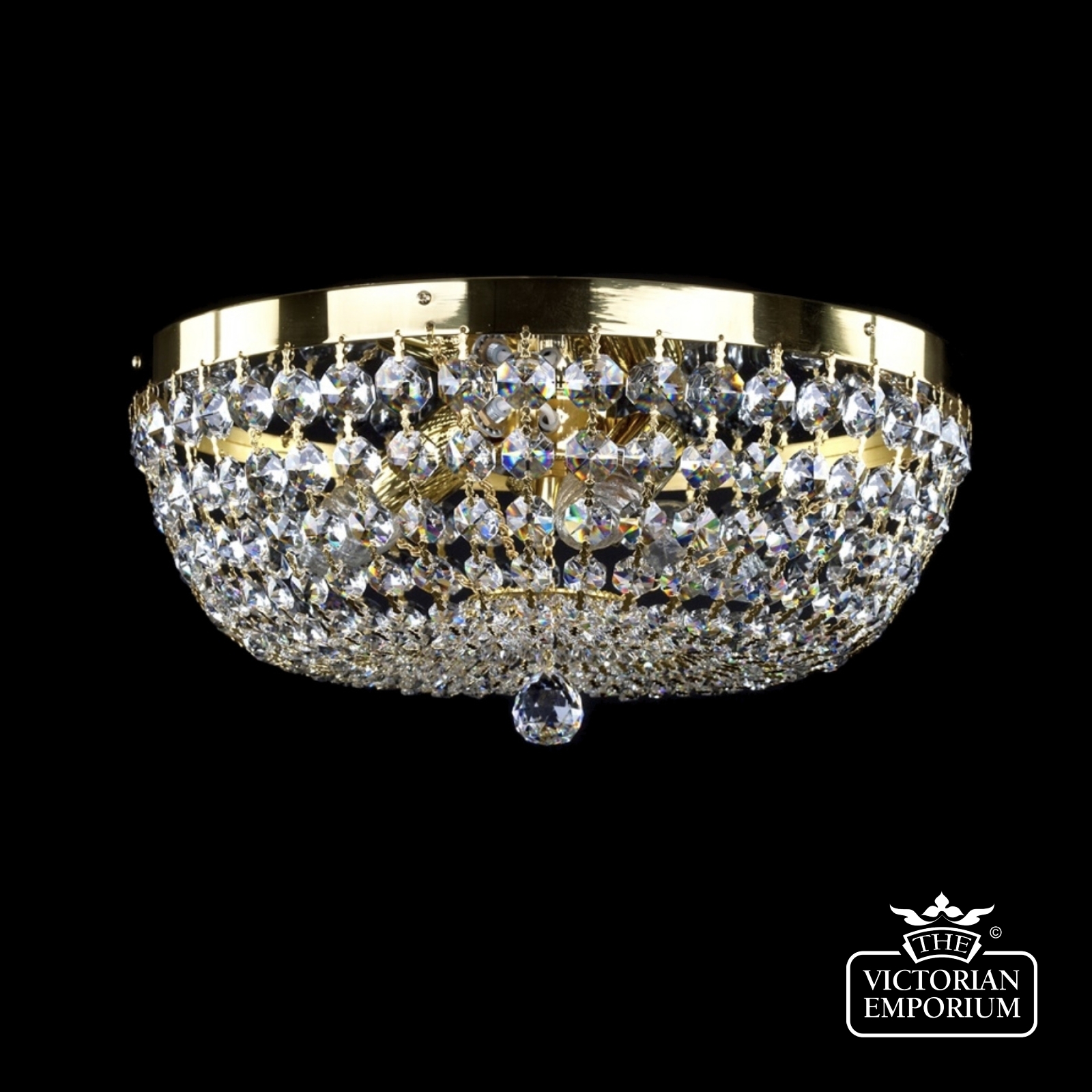 Beautiful low ceiling basket chandelier with a mirror finish inner plate and ornate frame. Dressed with 30% PbO bohemian crystal trimmings