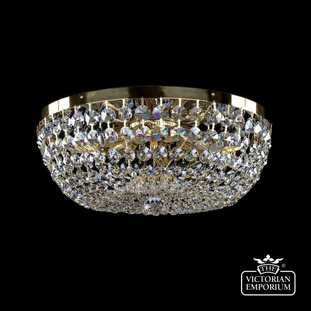 Medium sized low ceiling basket chandelier with a mirror finish inner plate and ornate frame. With 30% PbO bohemian crystal trimmings which reflect with the light.