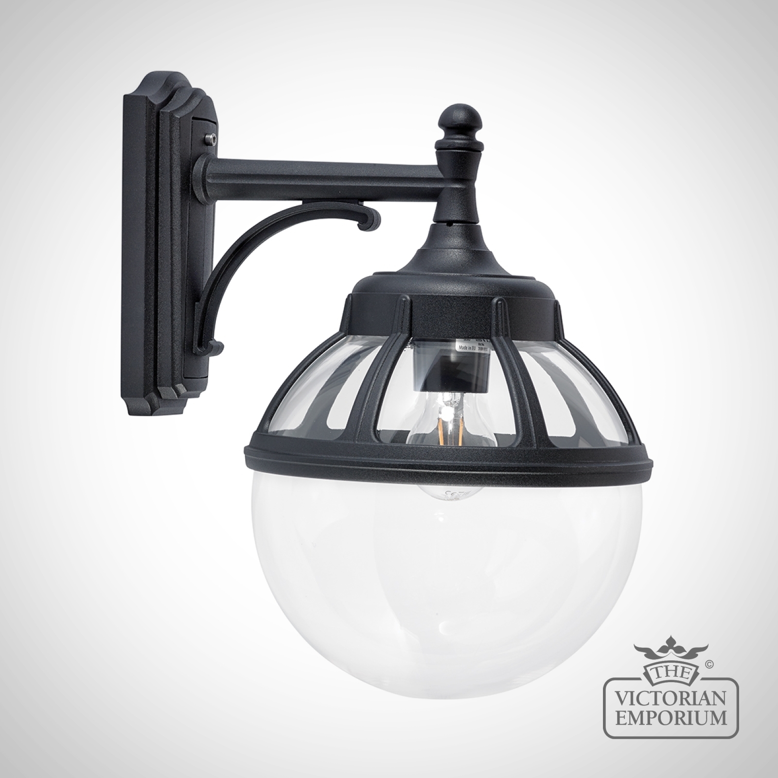 Spherical outdoor down wall light with clear shade and a decorative lamp holder