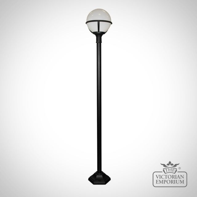 Spherical outdoor lamp post with opaque shade designed for extreme weather and coastal locations