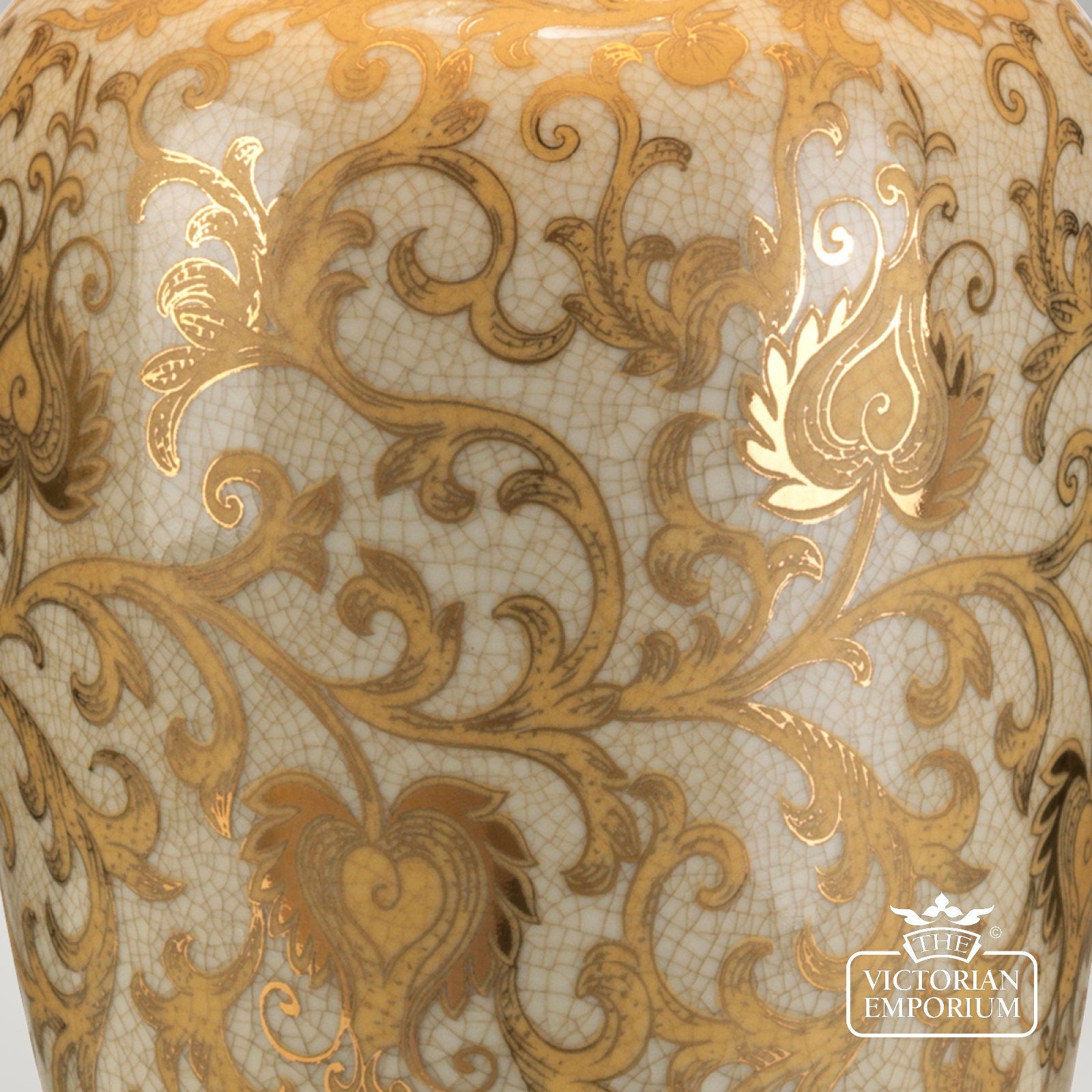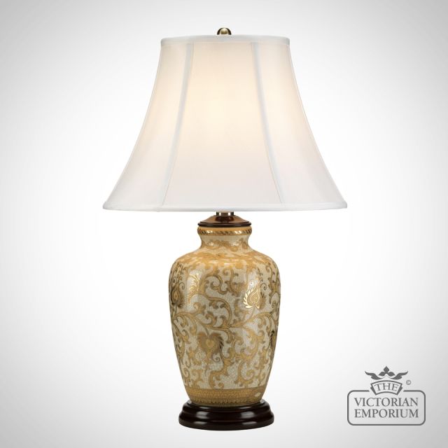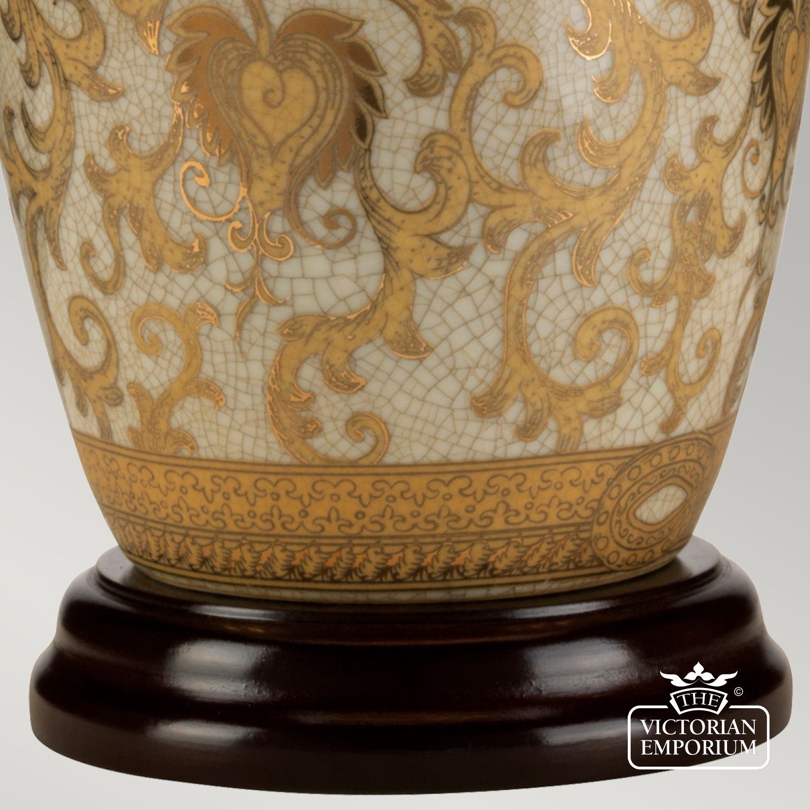 Chinese Porcelain table lamp with a 19cm Gold floral pattern over a White crackle glaze. Fitted with a wooden cap and base, 36cm White polycotton empire shade, and Satin Nickel finial.