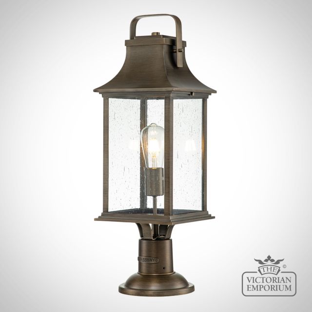 This is an attractive pedestal lantern in a Painted Burnished Bronze finish. Fabricated from Cast Aluminium with Clear Seeded Glass featuring an oversized handle