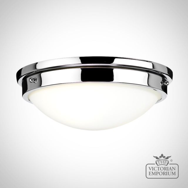 With its clean, simple lines and soft arcs, the Gravity flush is finished in either Polished Nickel or Polished Chrome and includes a White Opal Etched glass shade.