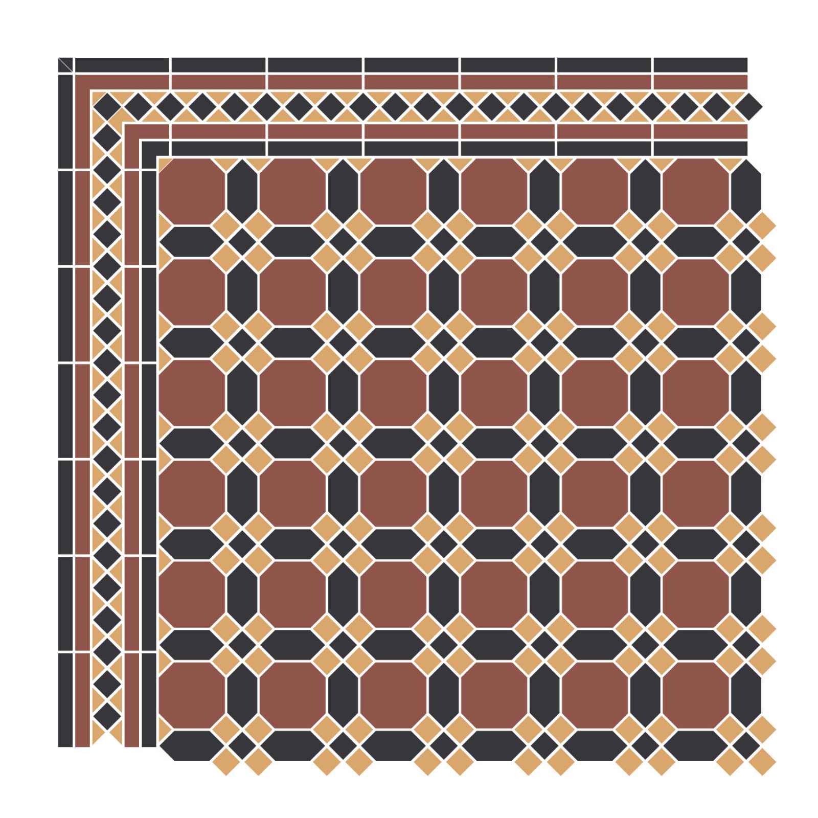 Victorian mosaic pattern tiles in Victorian colour pallet of black, red and yellow - sold by the sheet. Guildford pattern inset tiles design matches Guildford Border