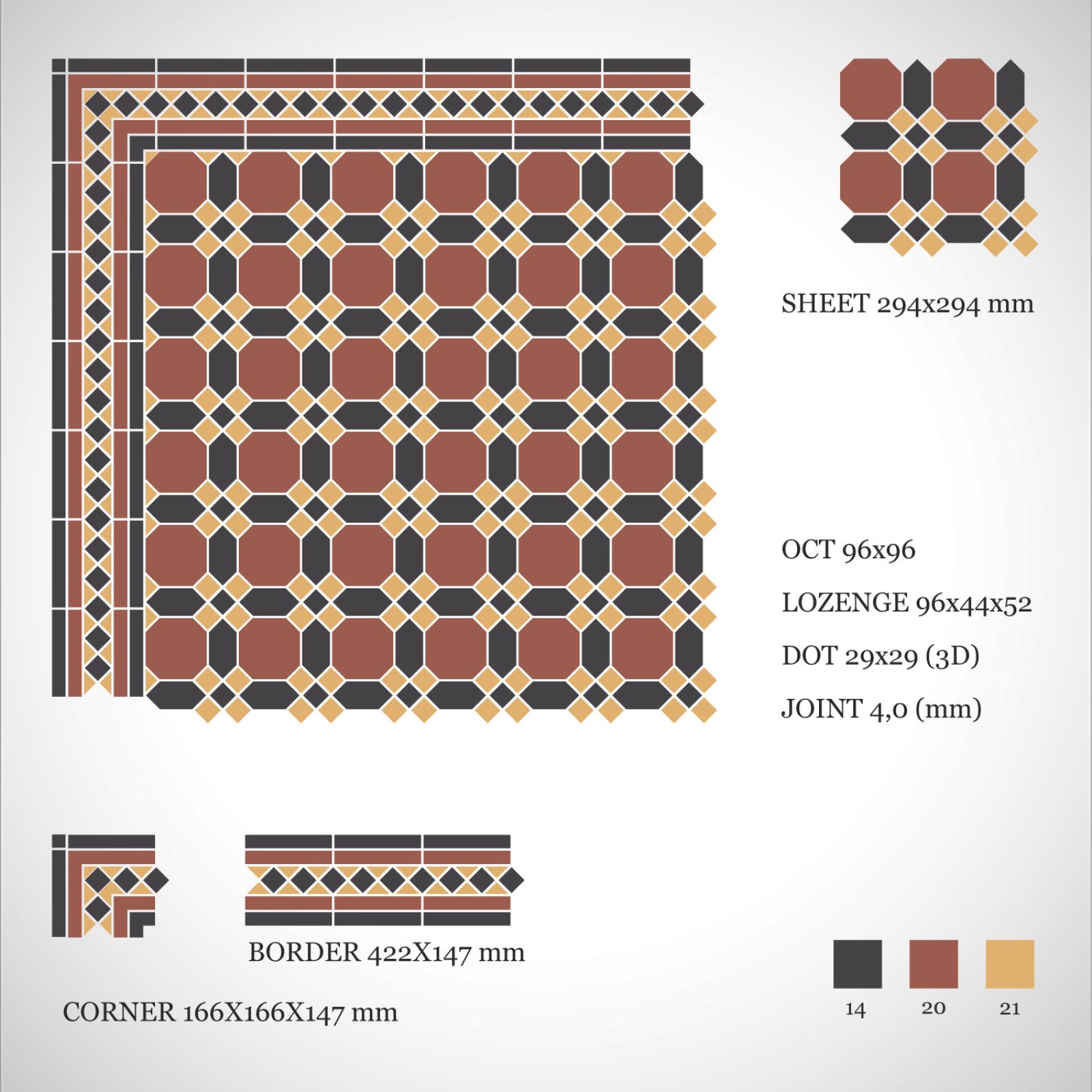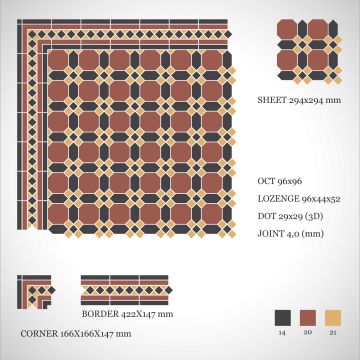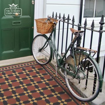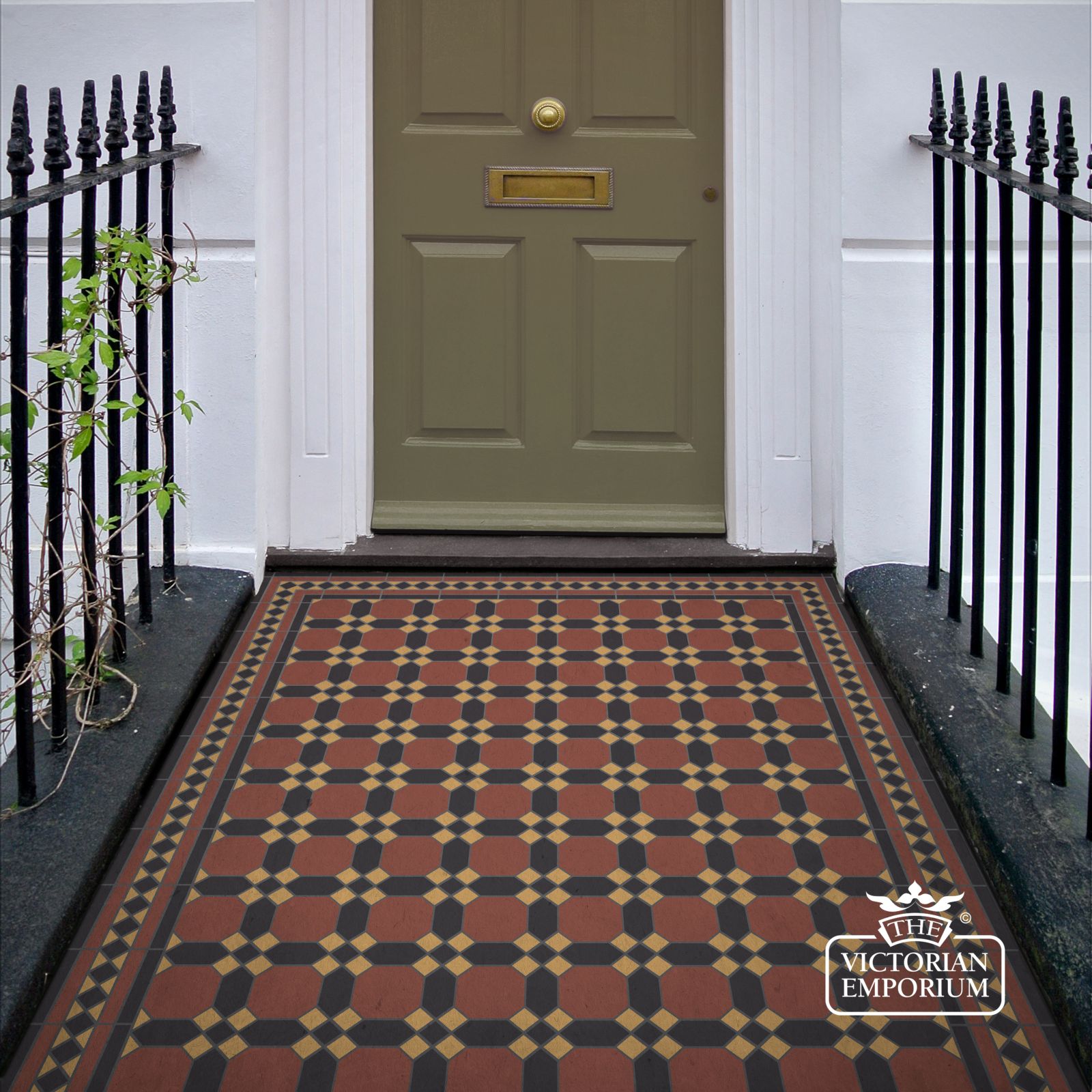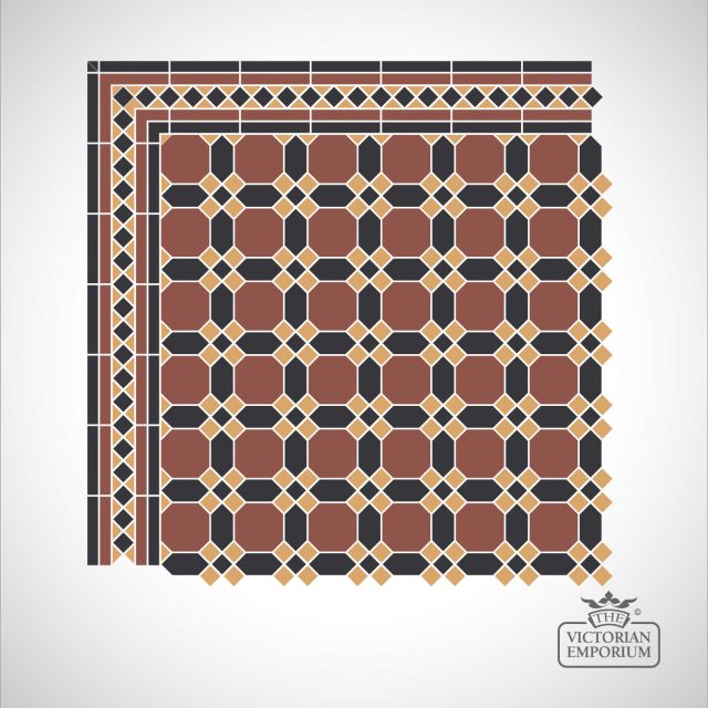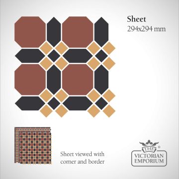 Victorian mosaic pattern tiles in Victorian colour pallet of black, red and yellow - sold by the sheet. Guildford pattern inset tiles design matches Guildford Border