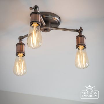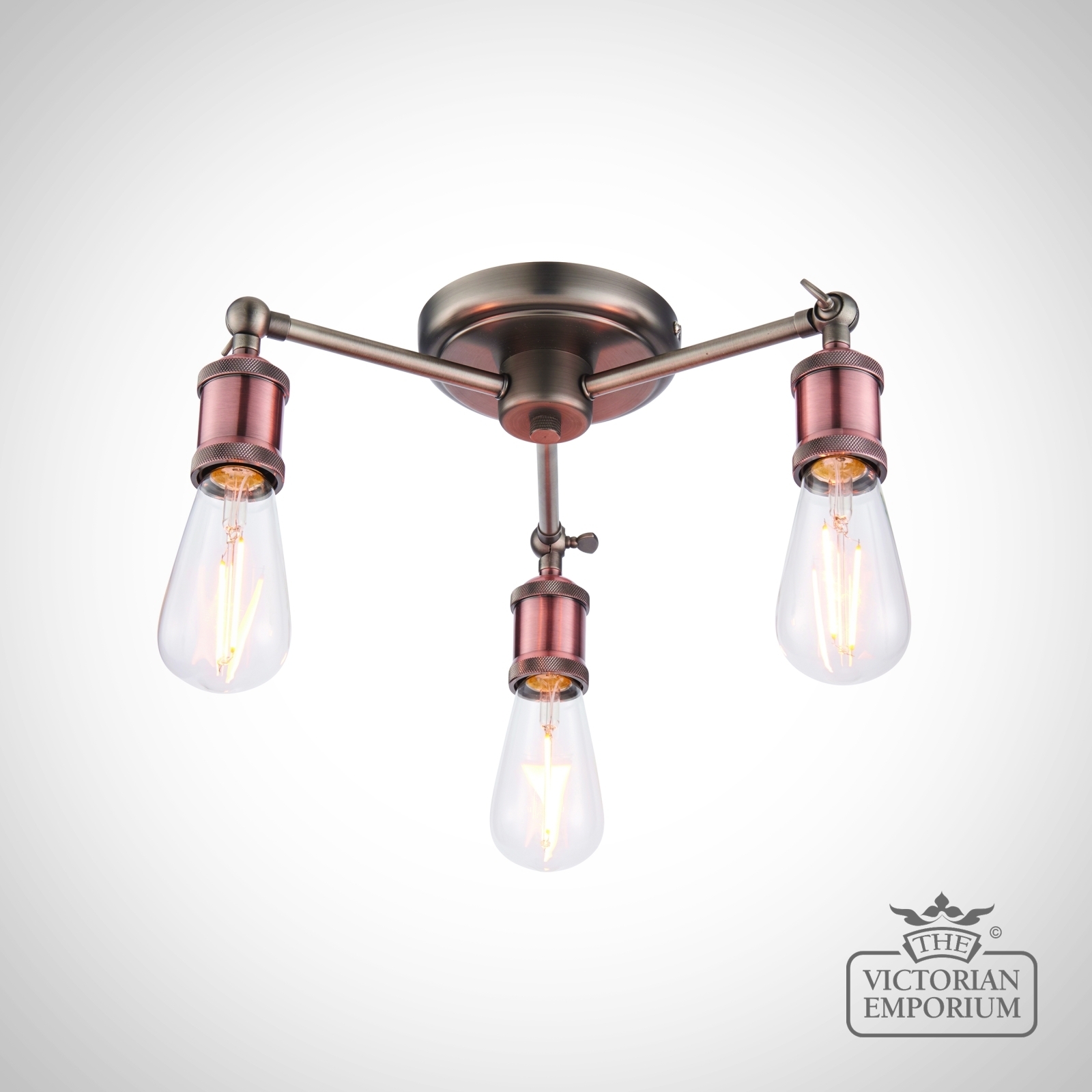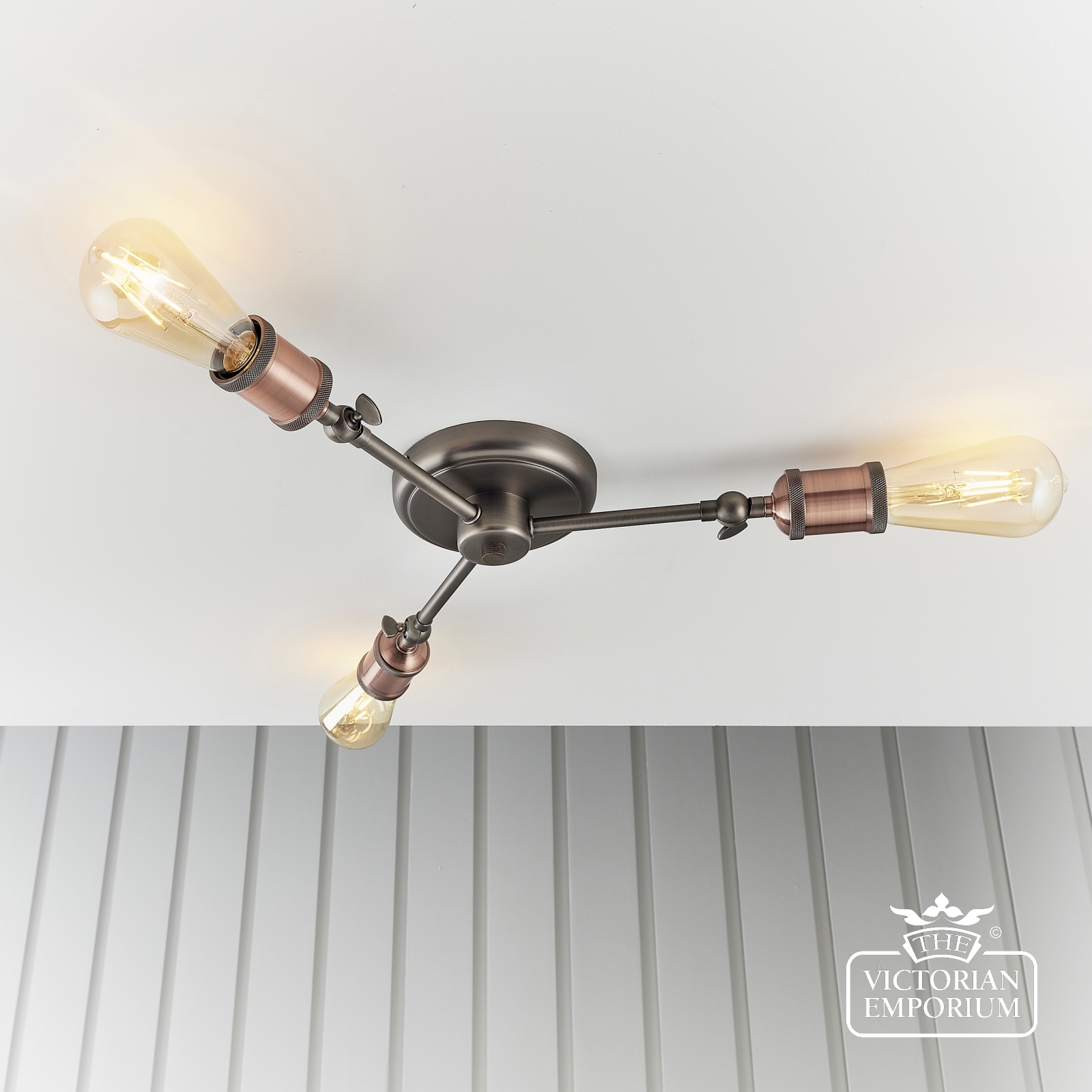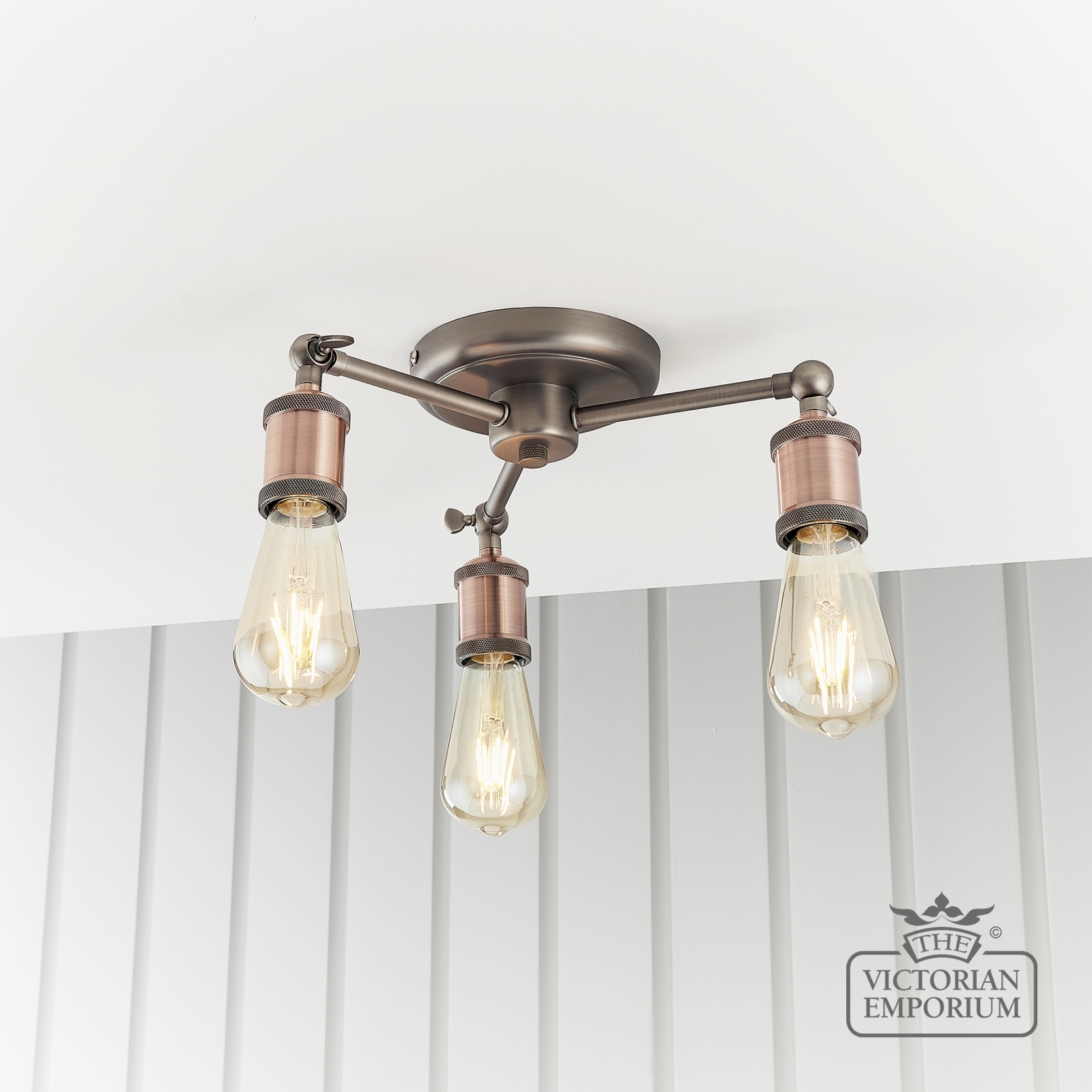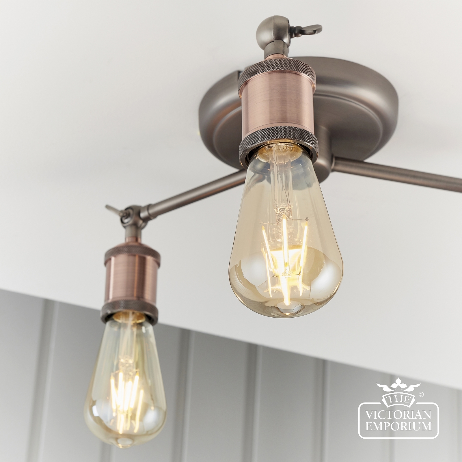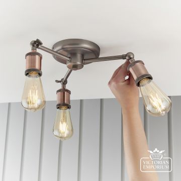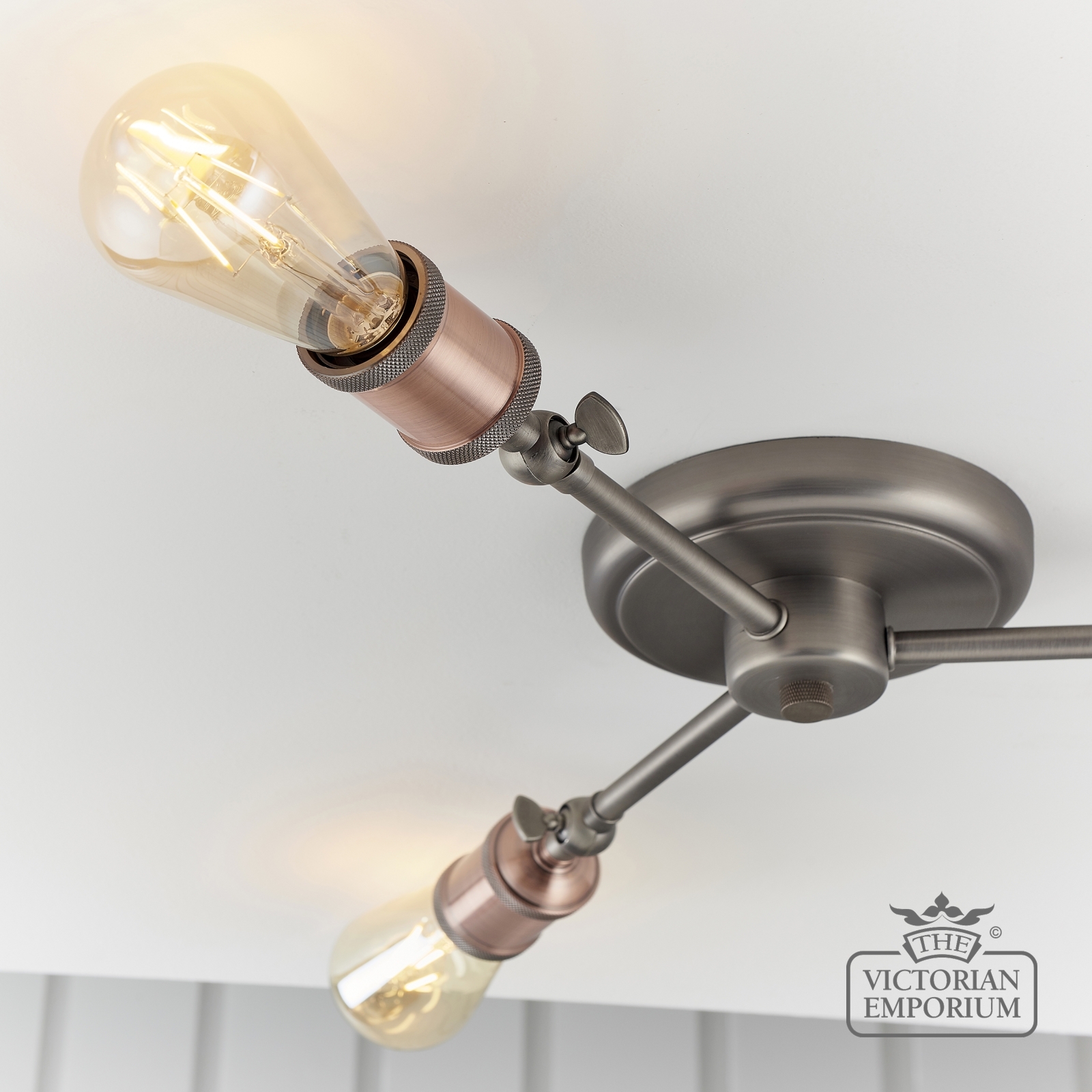An industrial styled compact ceiling light, finished in aged pewter and aged copper, and featuring adjustable knuckles and knurled lamp holders complete the authentic look.