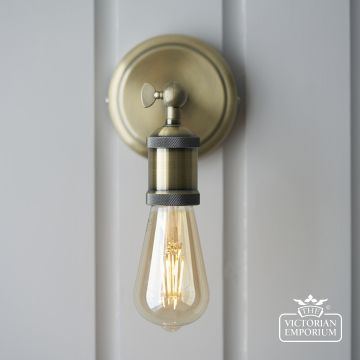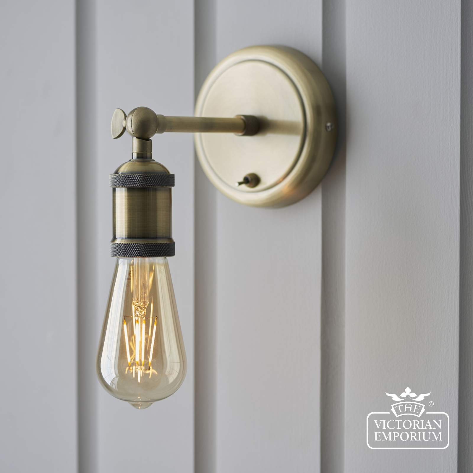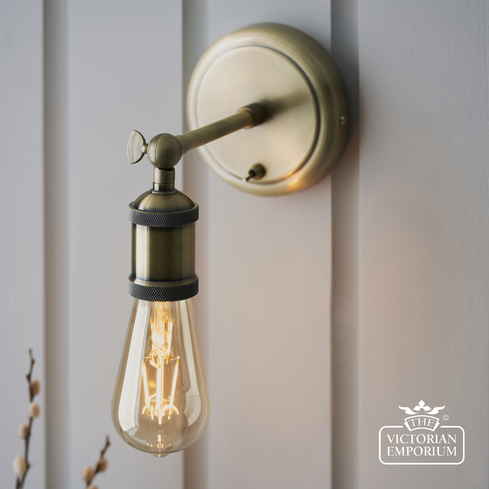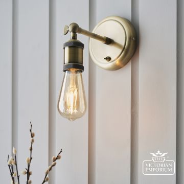 Antique brass finish has been applied to bring warmth and style to this industrial look wall light. With adjustable heads and on/off toggle switch.