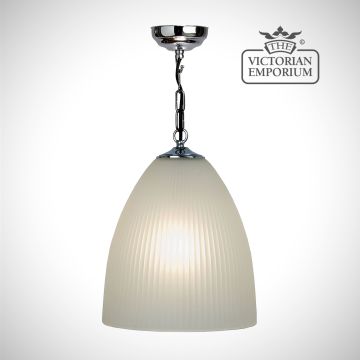 This is a pretty half oval shaped ceiling pendant featuring chrome metalwork and etched glass