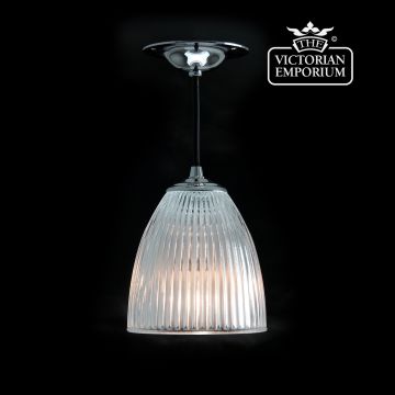 This is a pretty half oval shaped ceiling pendant featuring chrome metalwork