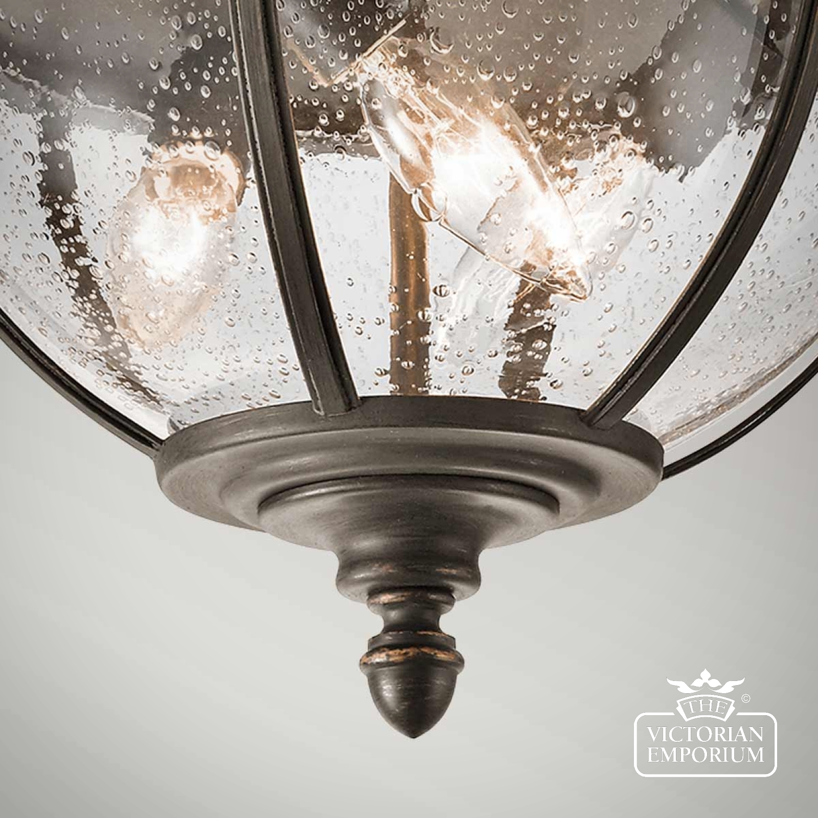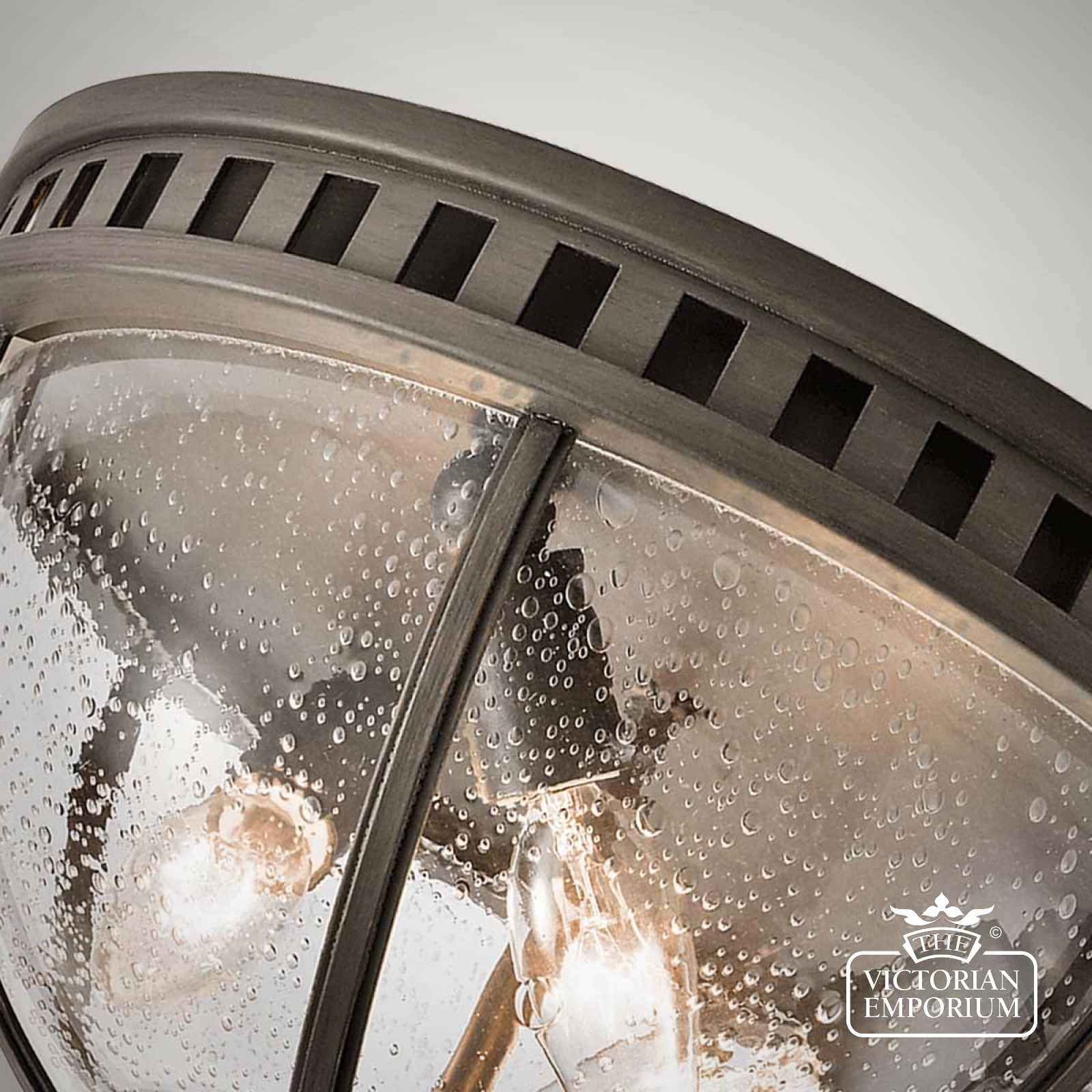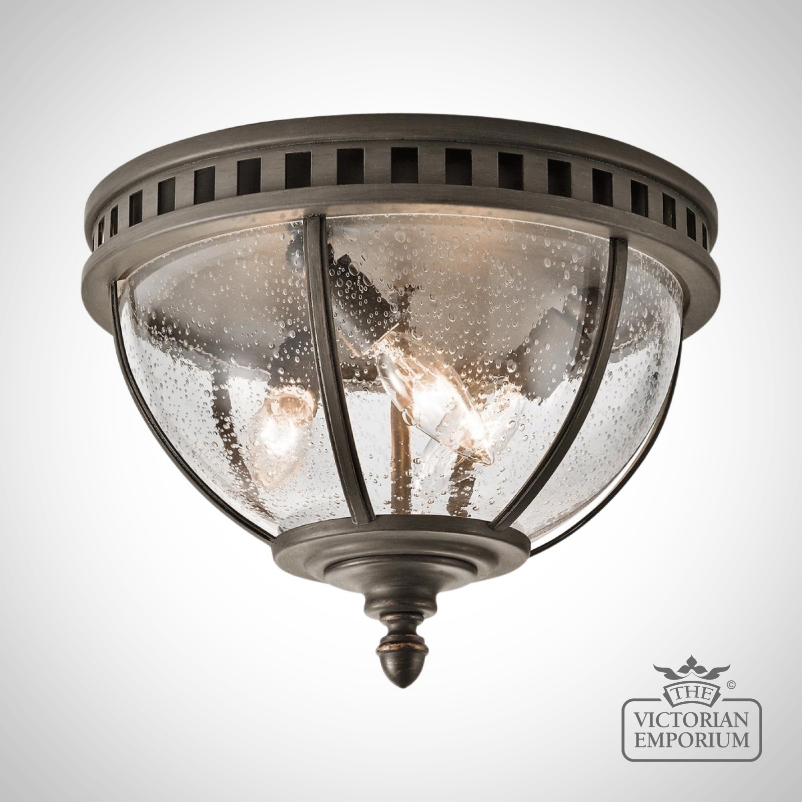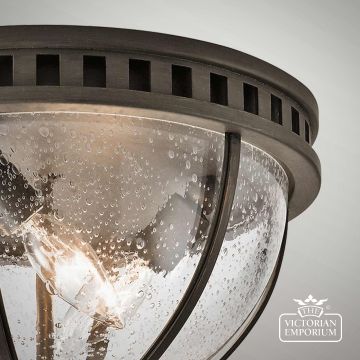 The Halleron flush mount light incorporates a traditional Victorian inspired design in a dark bronze finish
