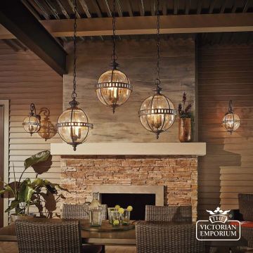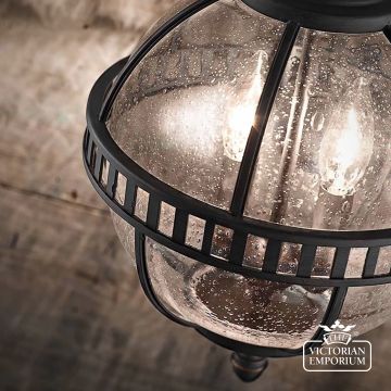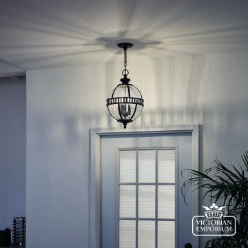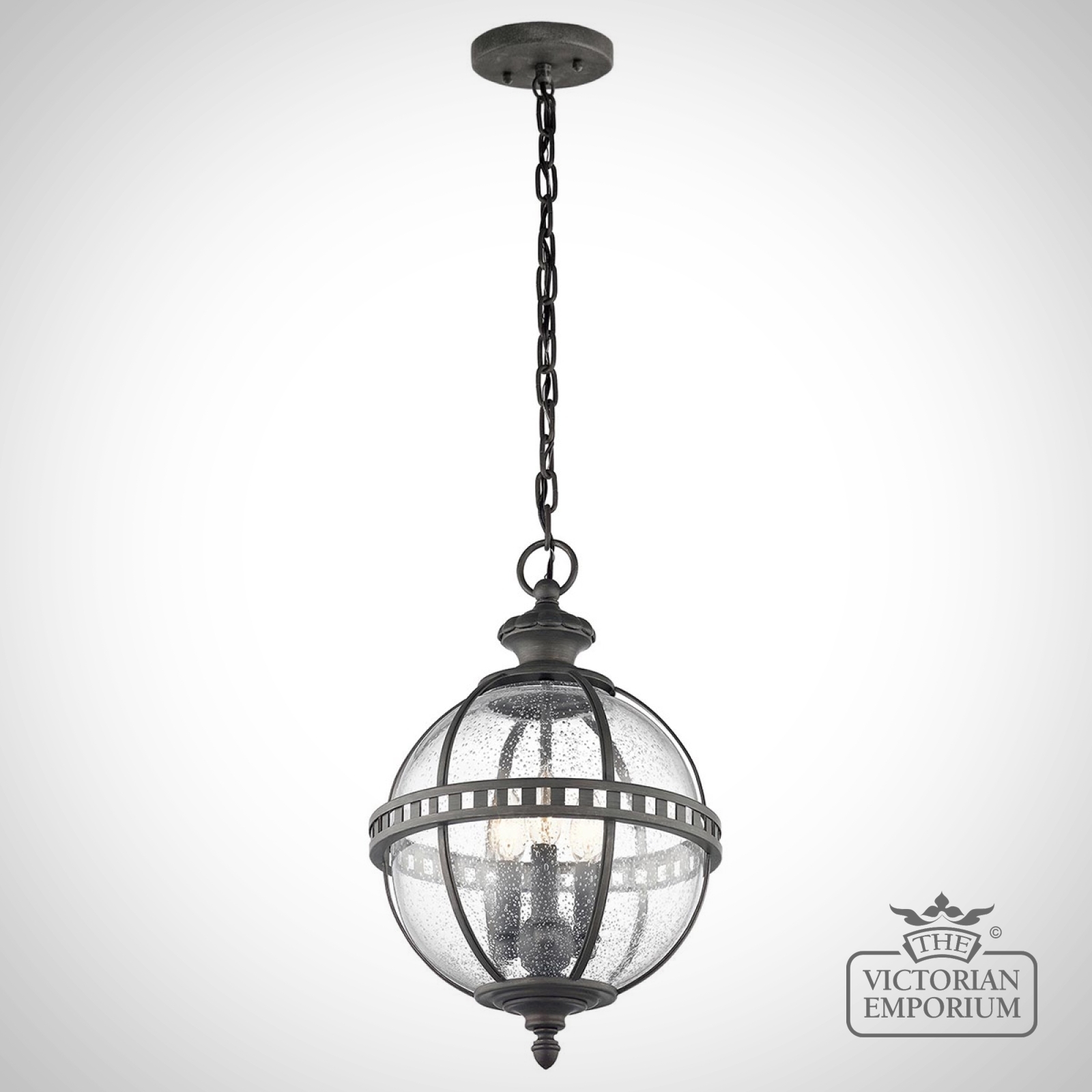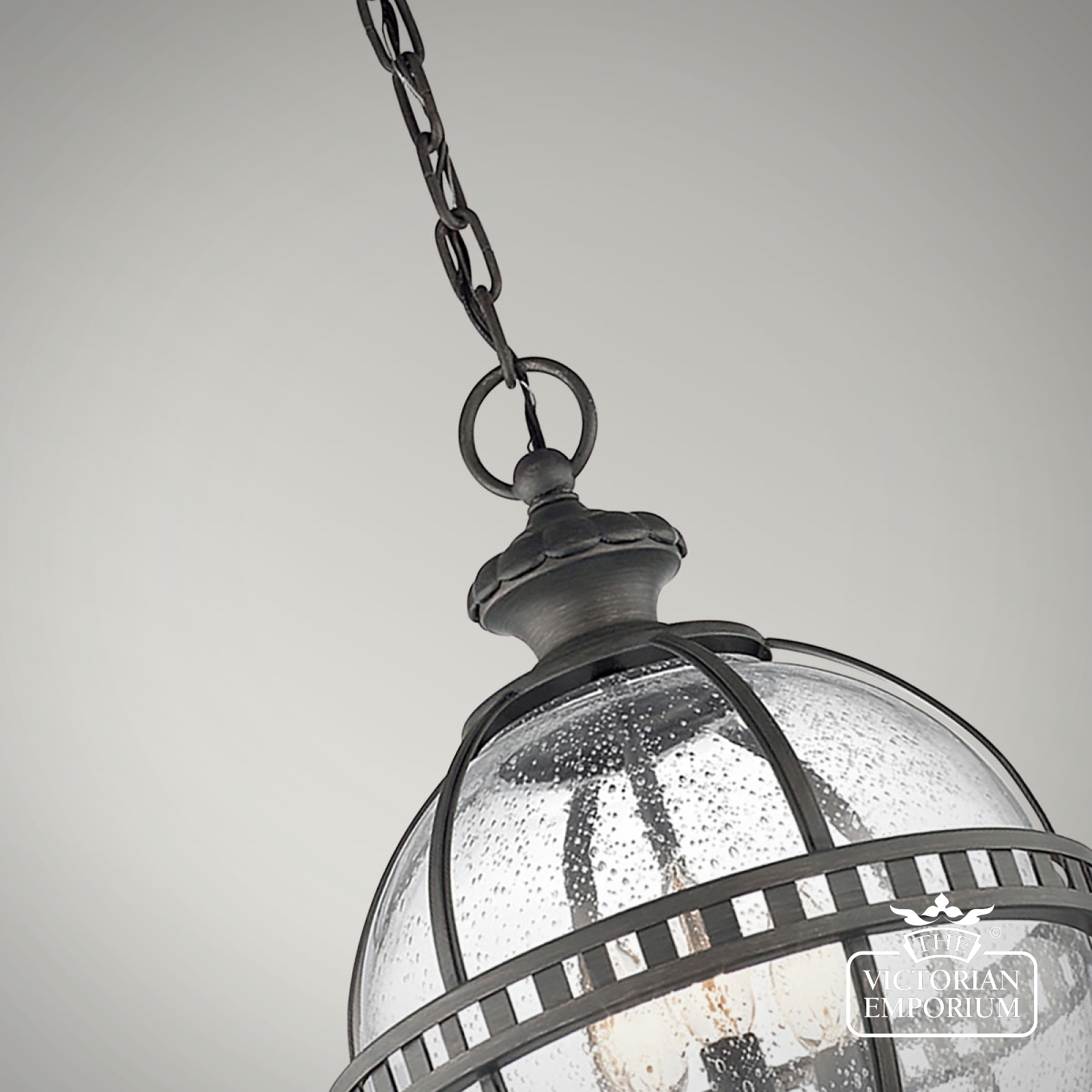 The Halleron chain lantern incorporates a traditional Victorian inspired design in a dark bronze finish with banding as a prominent feature of the design