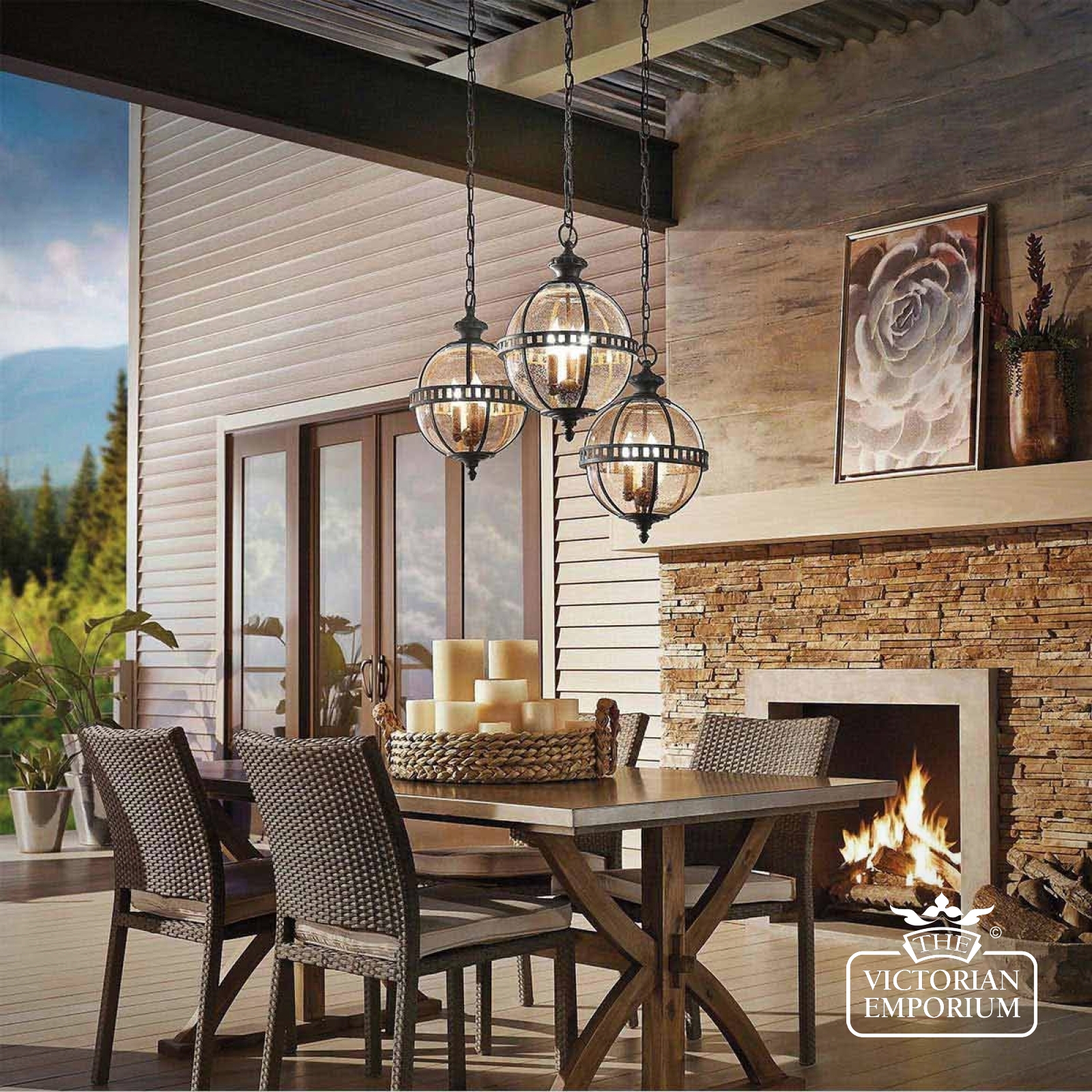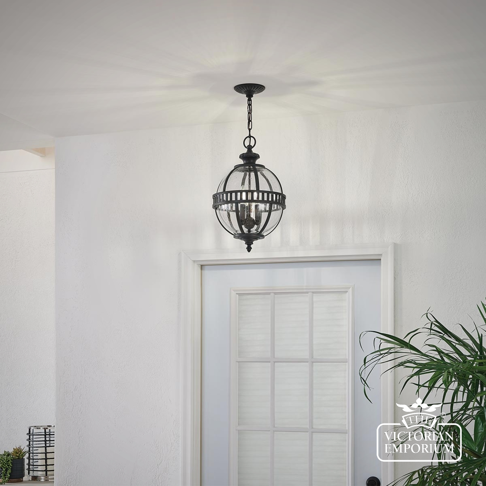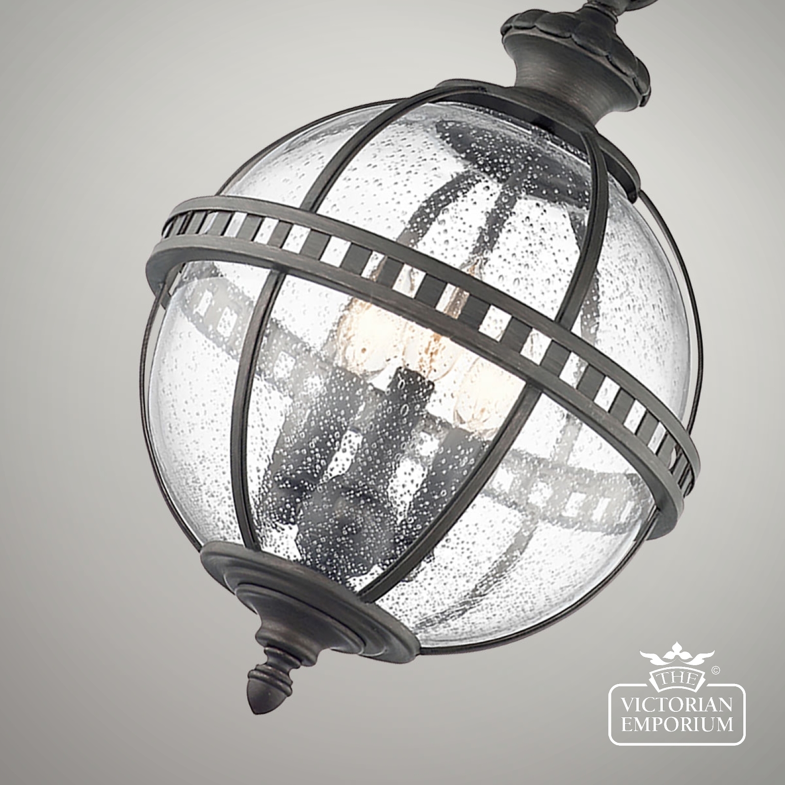 The Halleron chain lantern incorporates a traditional Victorian inspired design in a dark bronze finish with banding as a prominent feature of the design