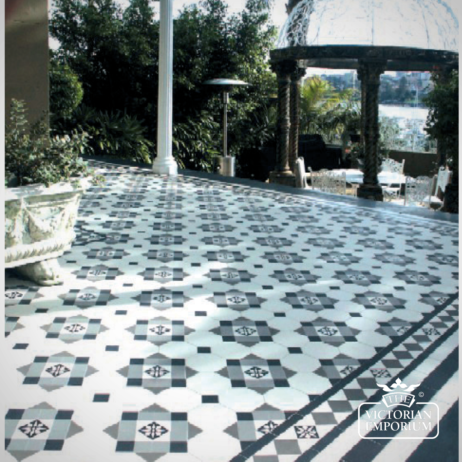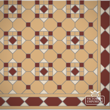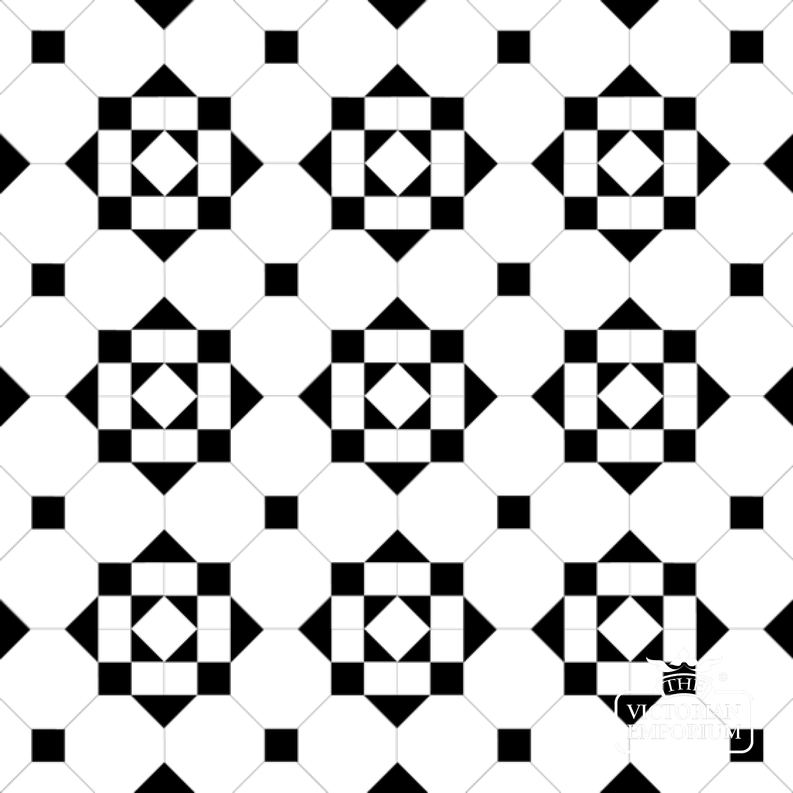 This is a beautiful classic Victorian floor design made up out of square, octagon and triangle tiles in two to five contrasting colours