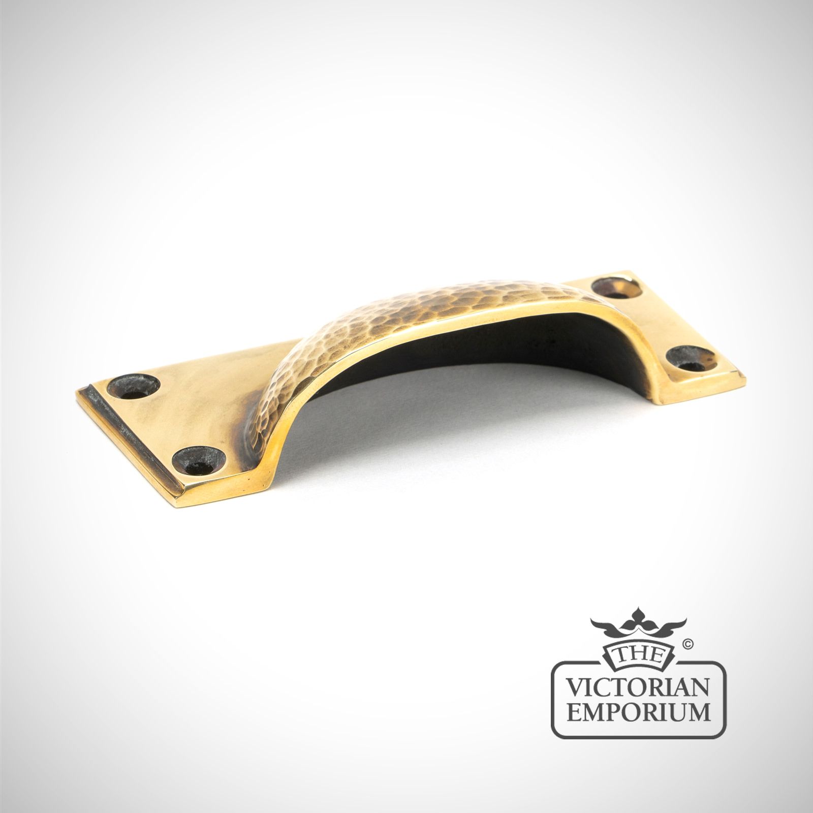 This is a high quality brass pull handle with an eyecatching hammered design in an aged brass finish which really complements the design.
