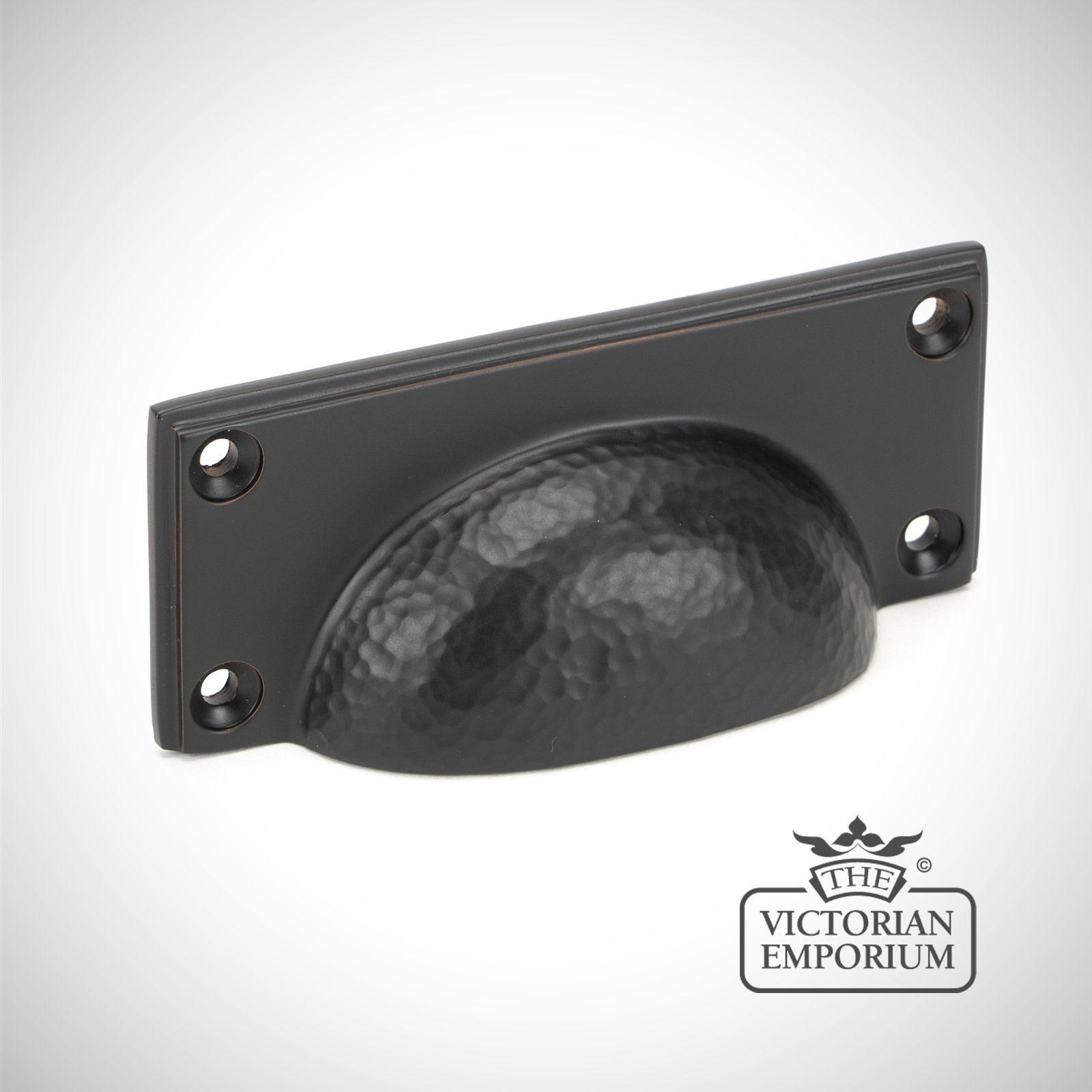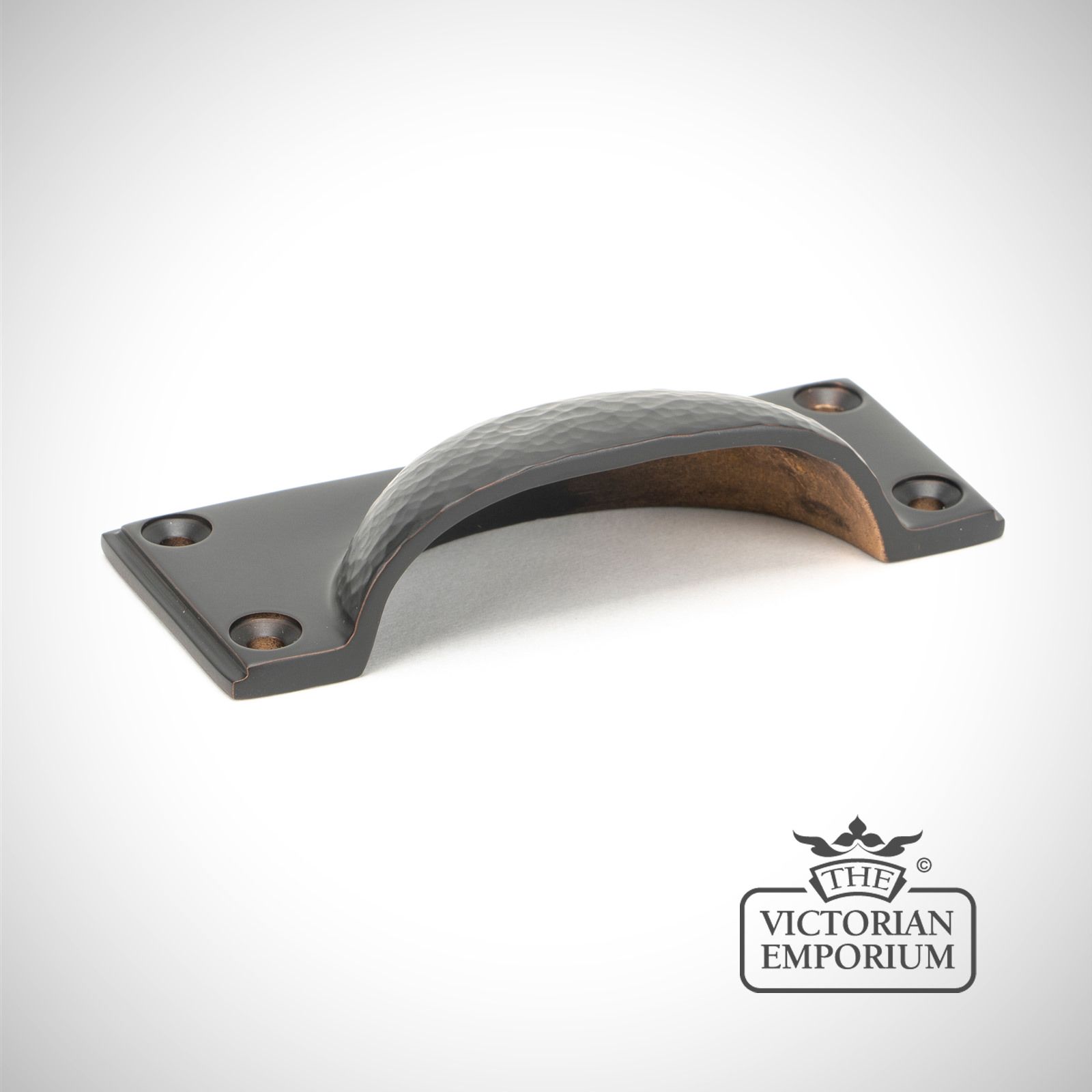 This is a high quality aged bronze pull handle with an eye catching hammered design which really complements the design.