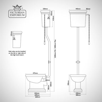 Classic High Level Toilet, a perfect choice for a Victorian style bathroom, with a choice of chrome, Nickel or Copper Flush Pipe Kit sets. Includes a pan, cistern, flush pipe kit, cistern lever and toilet seat.