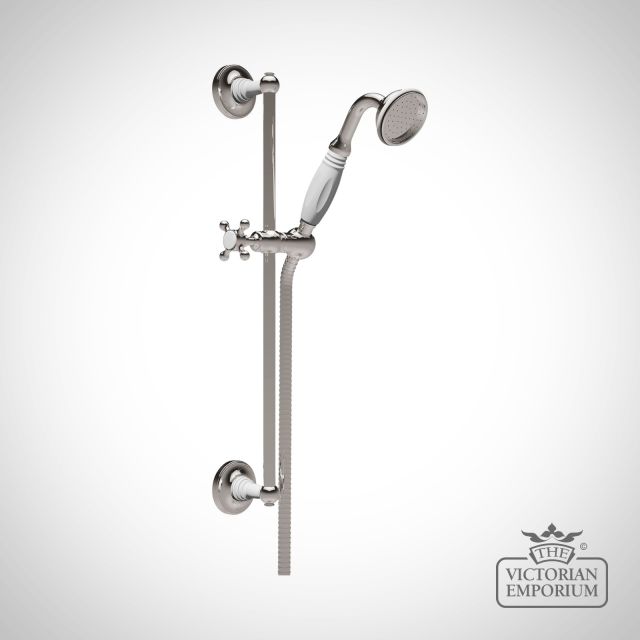 This is a classic hand held shower on a slider rail available in a choice of finishes, plated onto solid brass parts