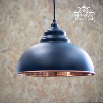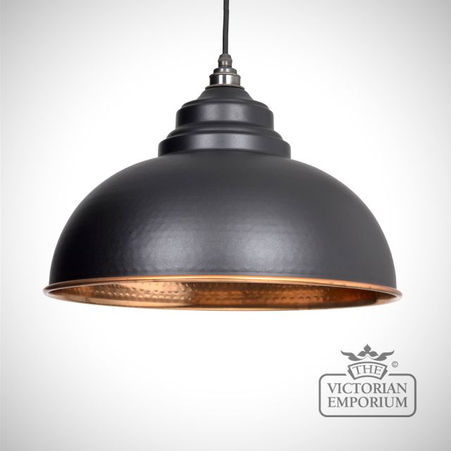 This pendant embodies classic design with rounded edges and lovely proportions to make it the perfect focal point in any room. This model has a black exterior and a hammered copper interior