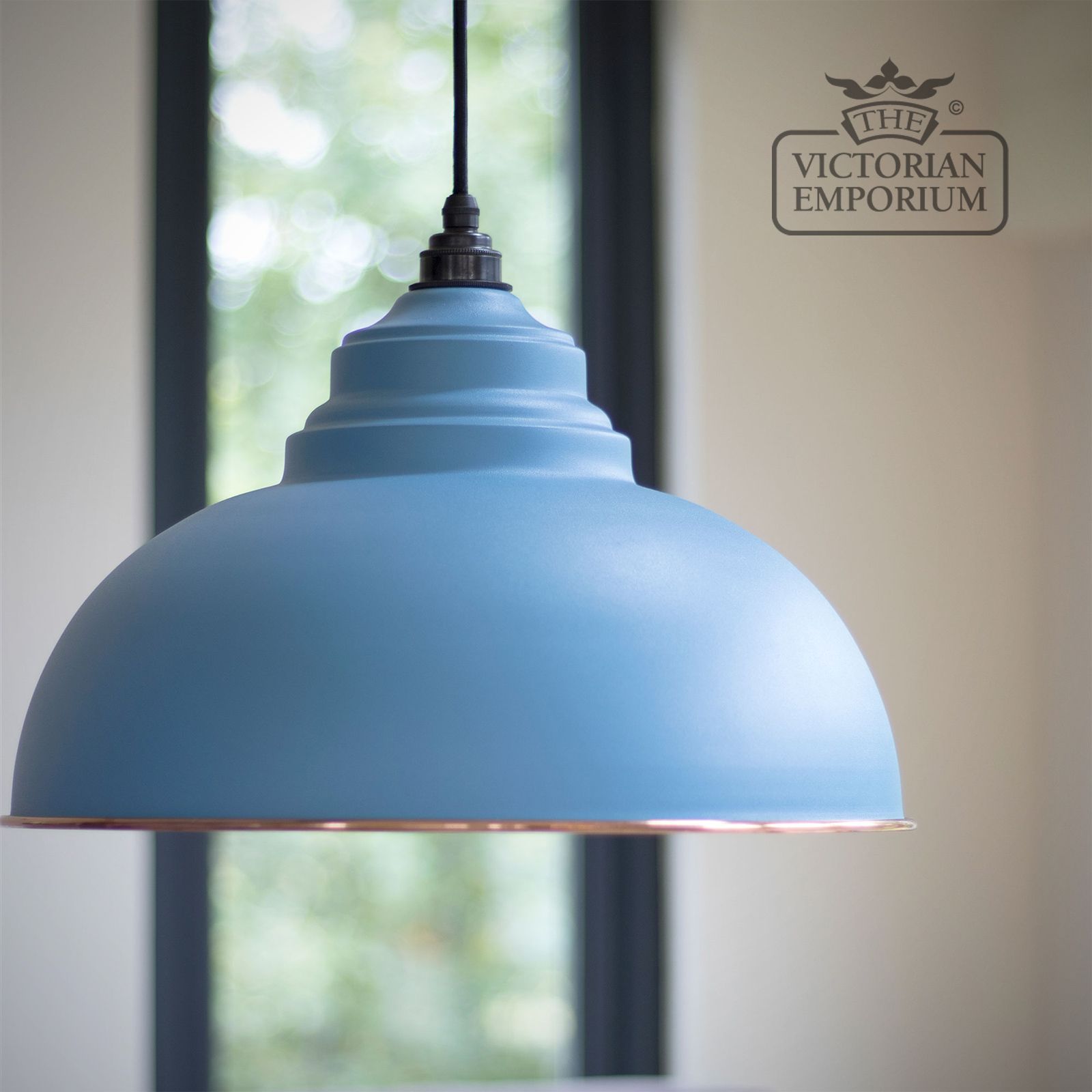 The Harlow pendant is a classic design with rounded edges and perfect proportions to make it the perfect focal point in any room. This model has a Matt Pale Blue exterior and White Gloss interior