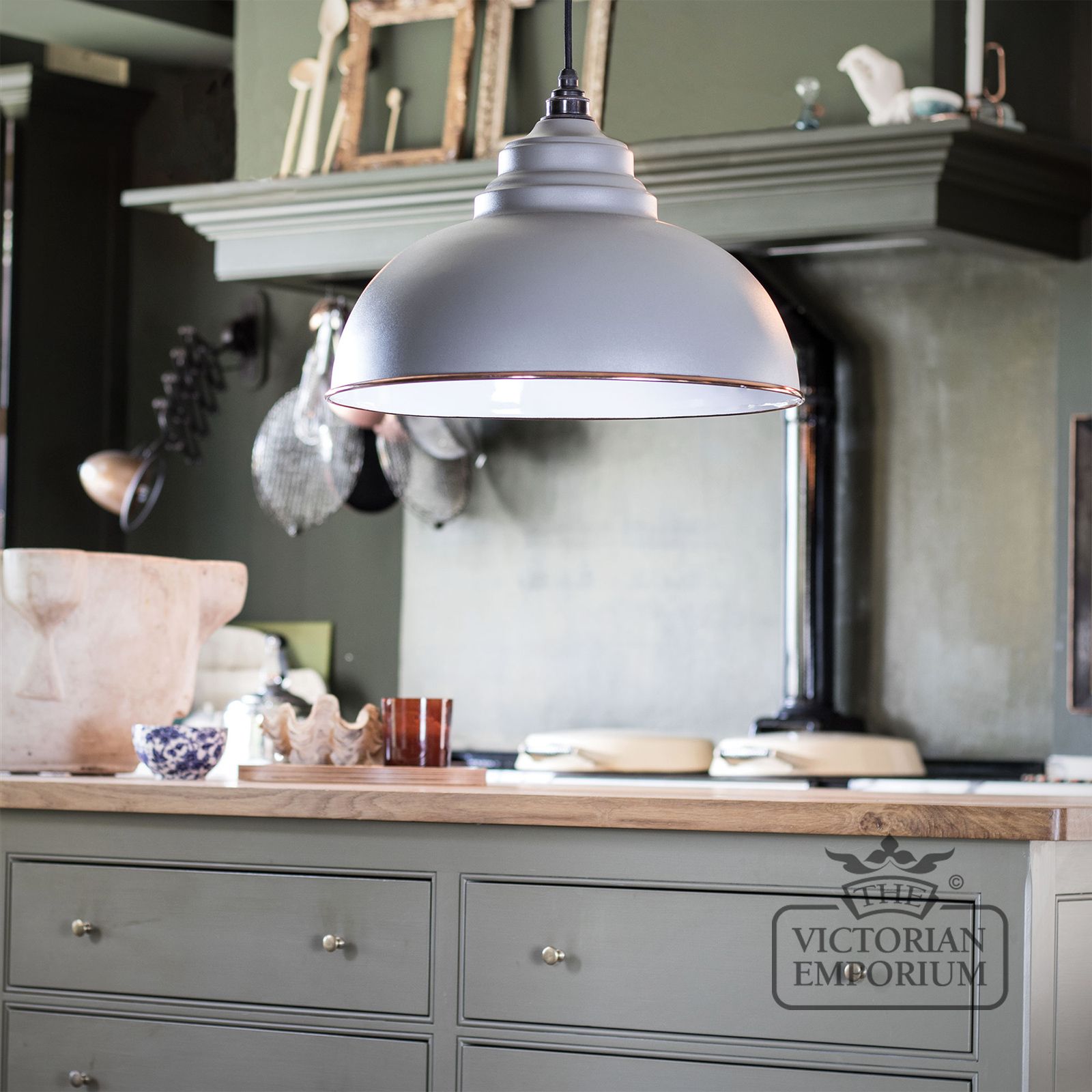 This pendant is hand spun from solid copper and finished in copper with a black fabric cable. Matt Sage Green exterior & White Gloss interior