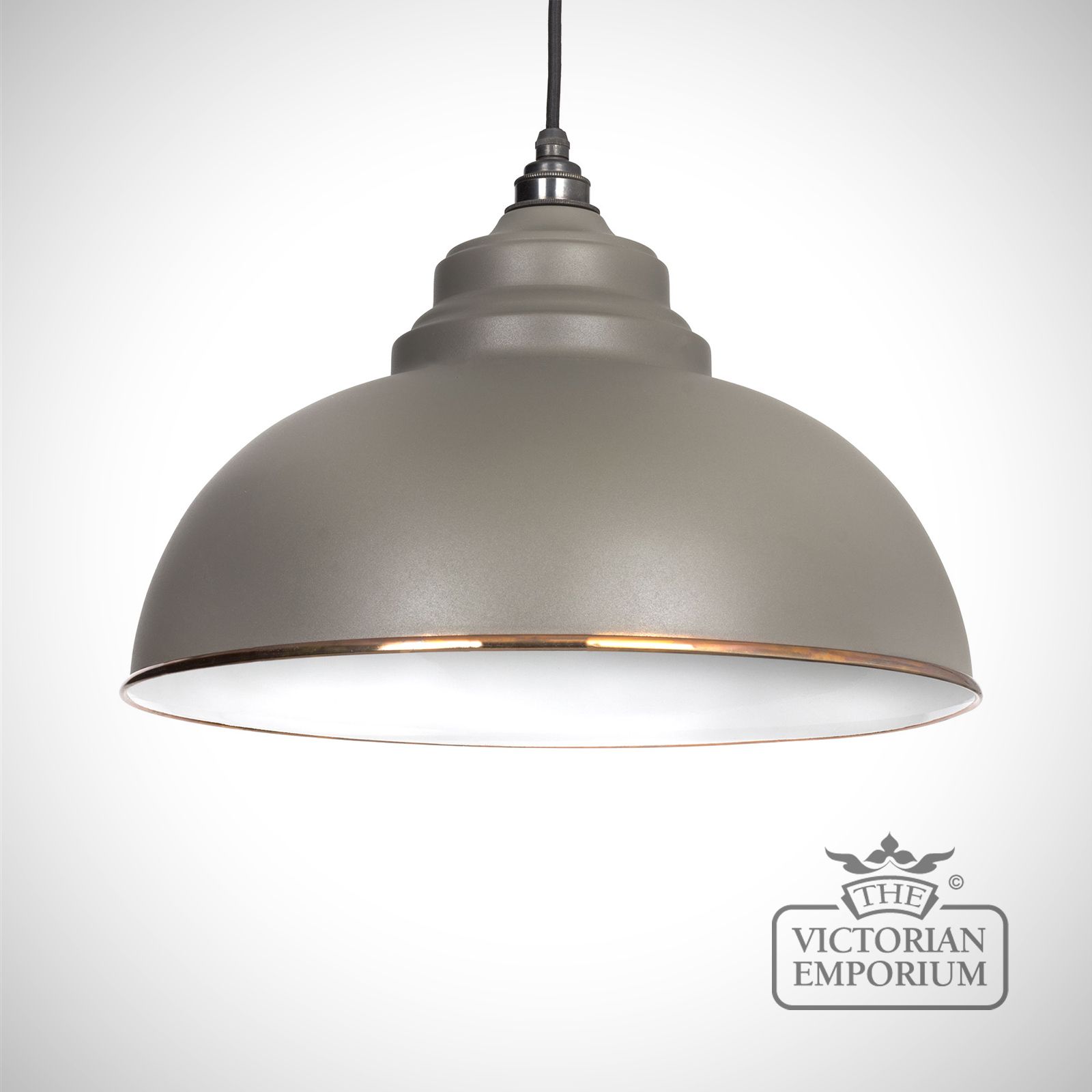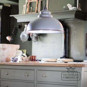 The Harlow pendant is a classic design with rounded edges and perfect proportions to make it the perfect focal point in any room. This model has a Matt Warm Grey exterior and White Gloss interior
