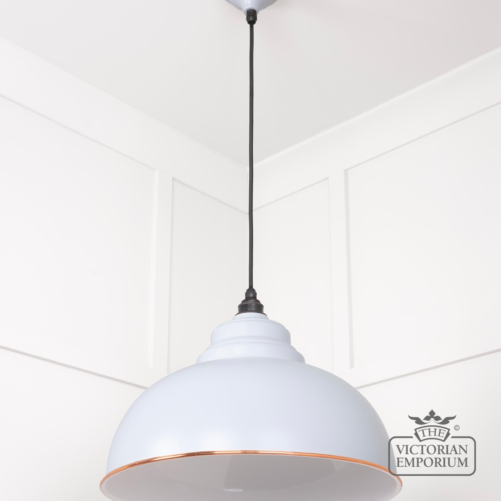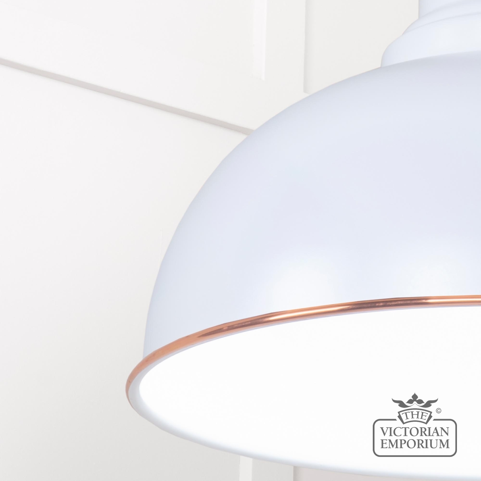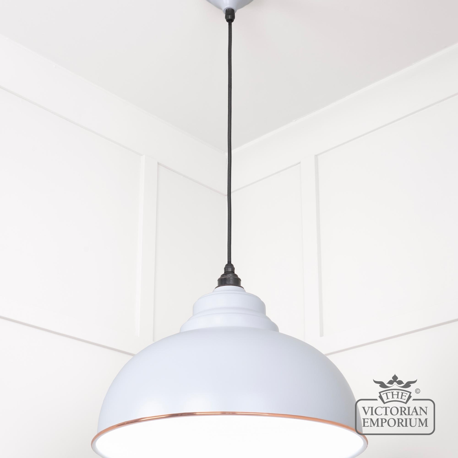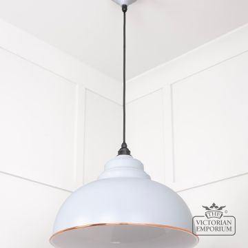 This pendant is hand spun from solid copper and finished in white gloss with a black fabric cable. This model has a Birch exterior and white gloss interior