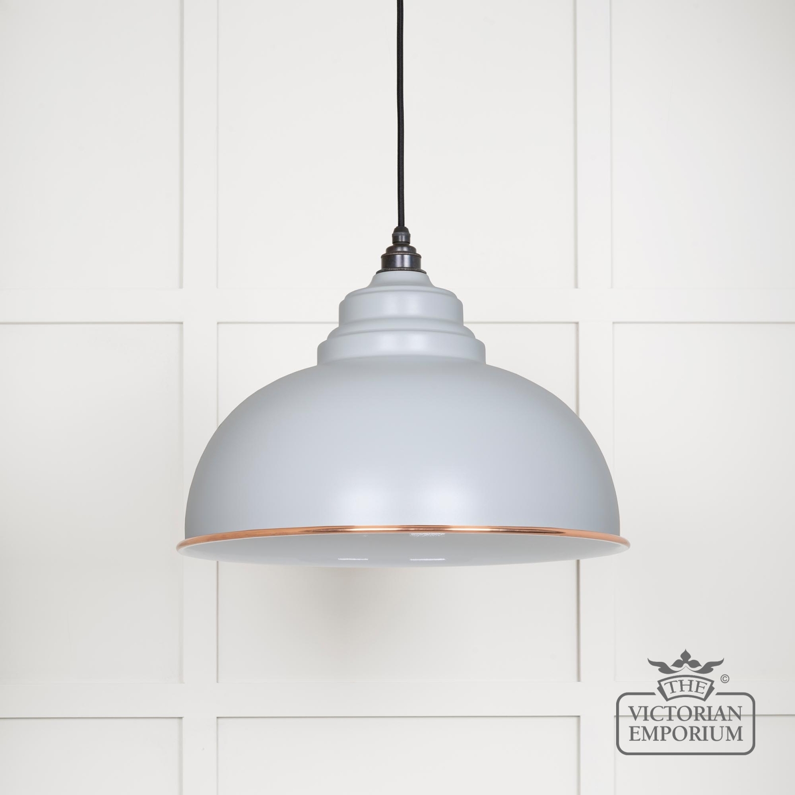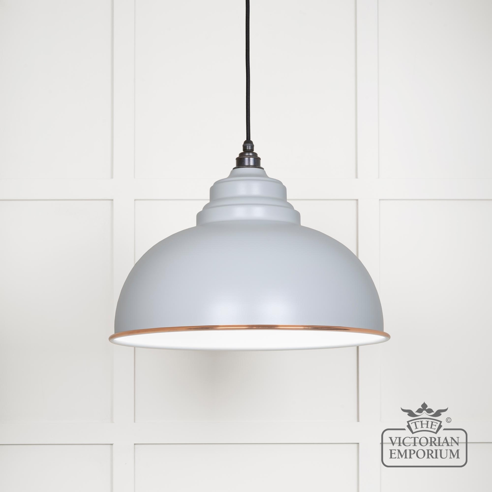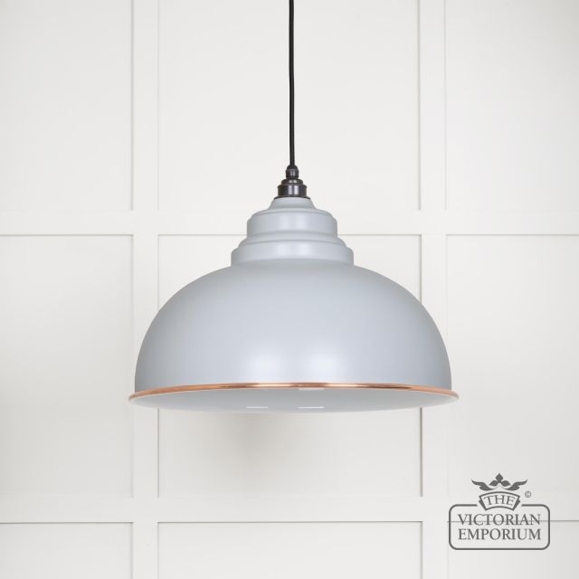 This pendant is hand spun from solid copper and finished in white gloss with a black fabric cable. This model has a Birch exterior and white gloss interior