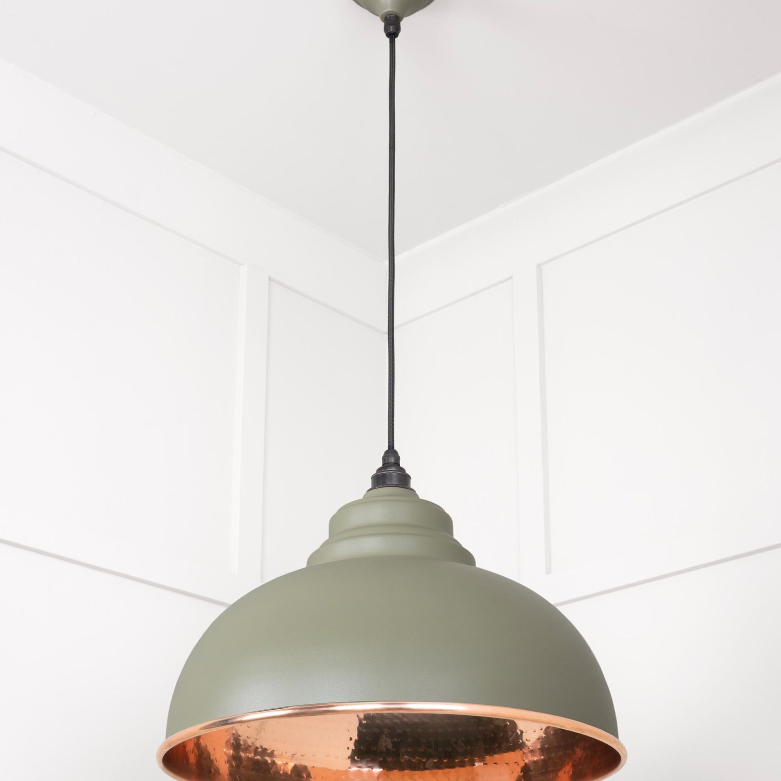 This pendant is hand spun from solid copper and finished in hammered copper with a black fabric cable. This model has a smooth copper interior and painted tump exterior