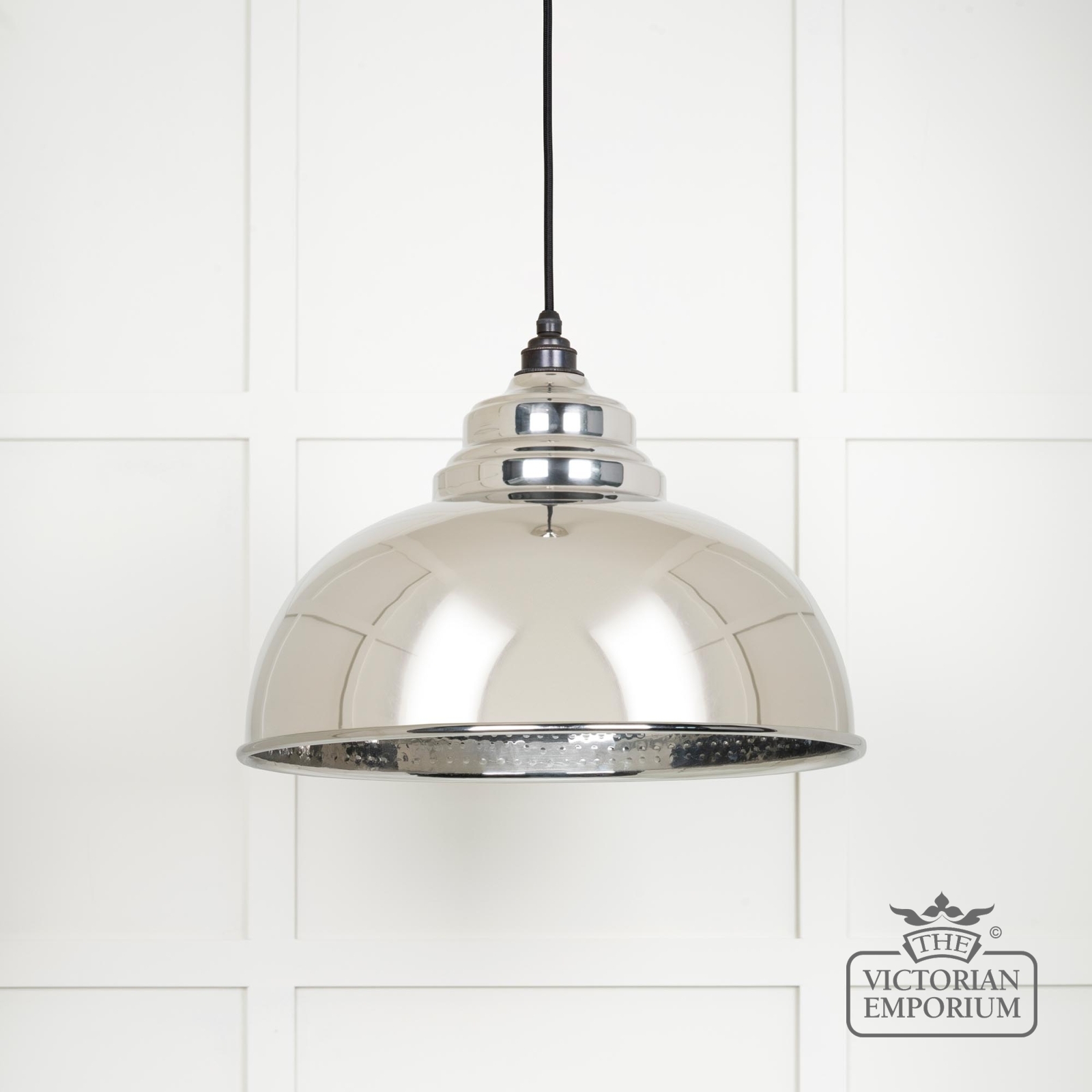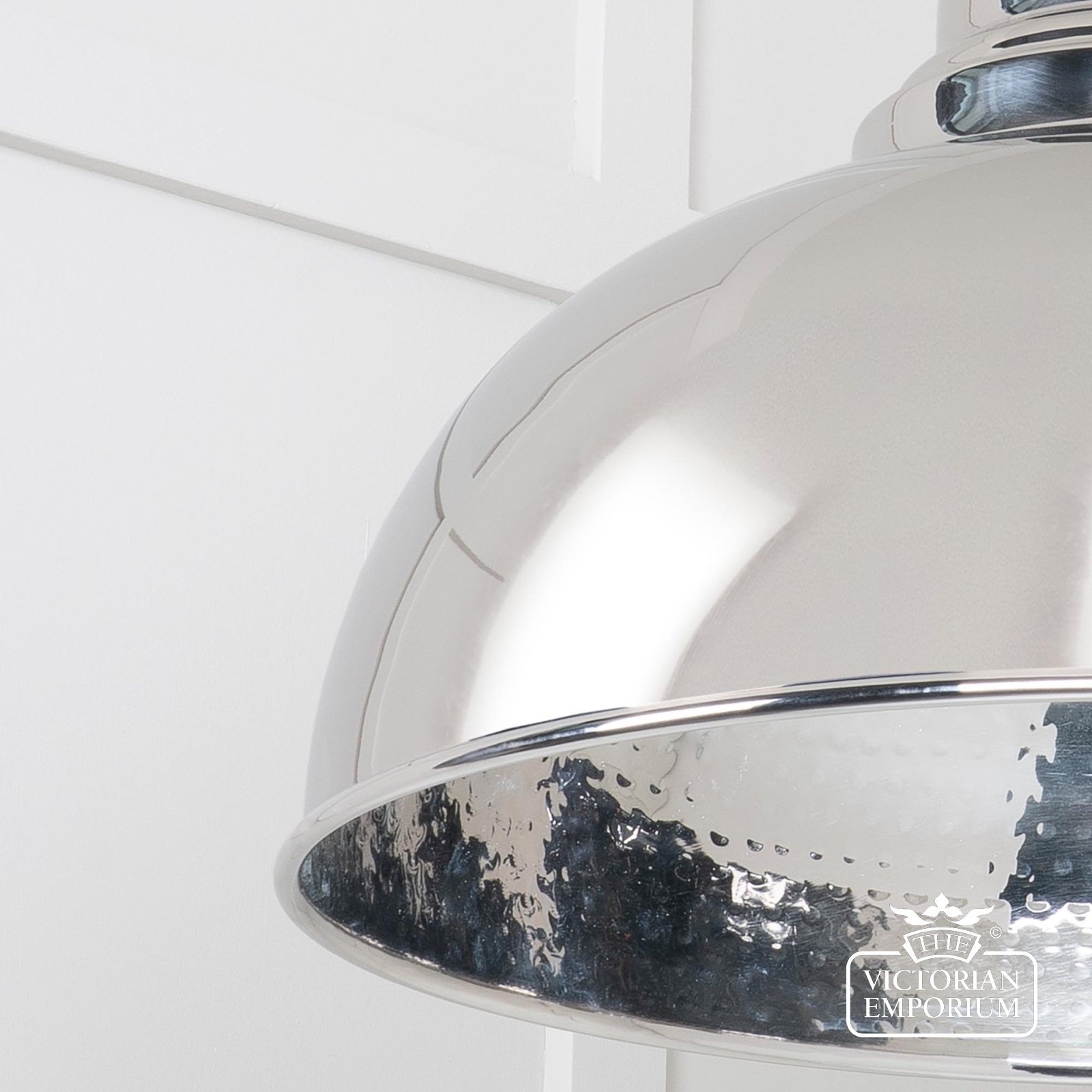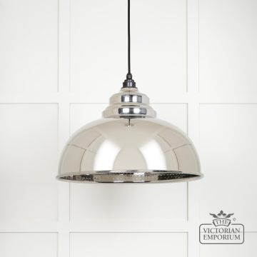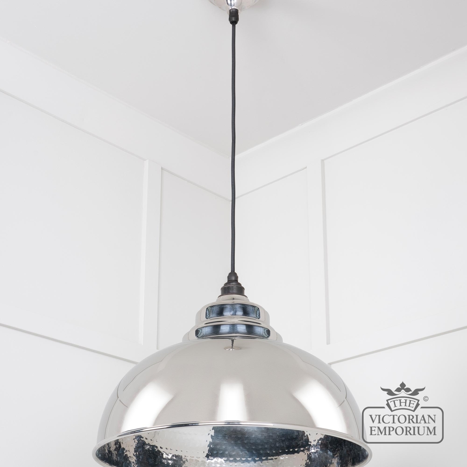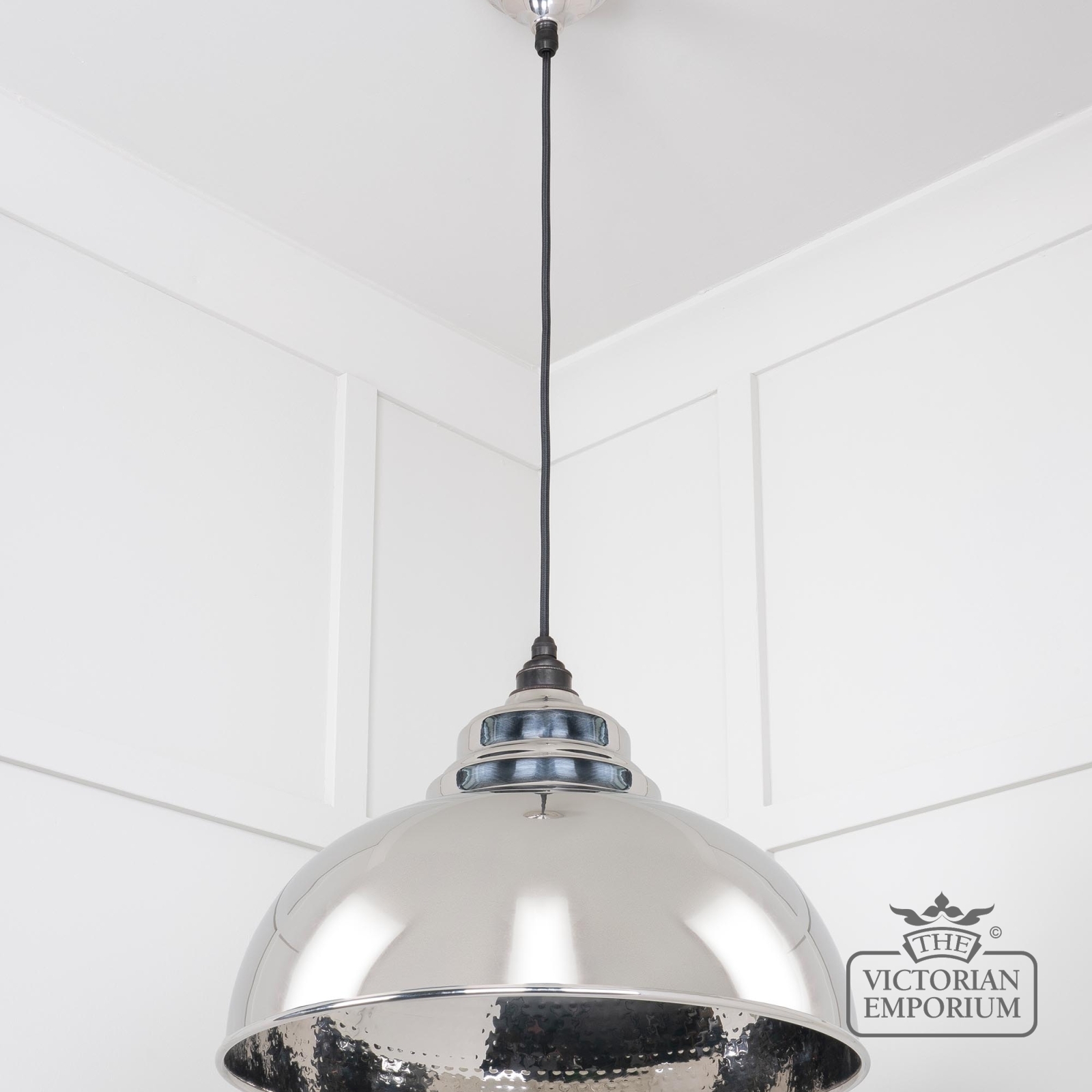 This pendant is hand spun from solid brass and finished in smooth nickel with a black fabric cable. This model has a smooth nickel interior and exterior