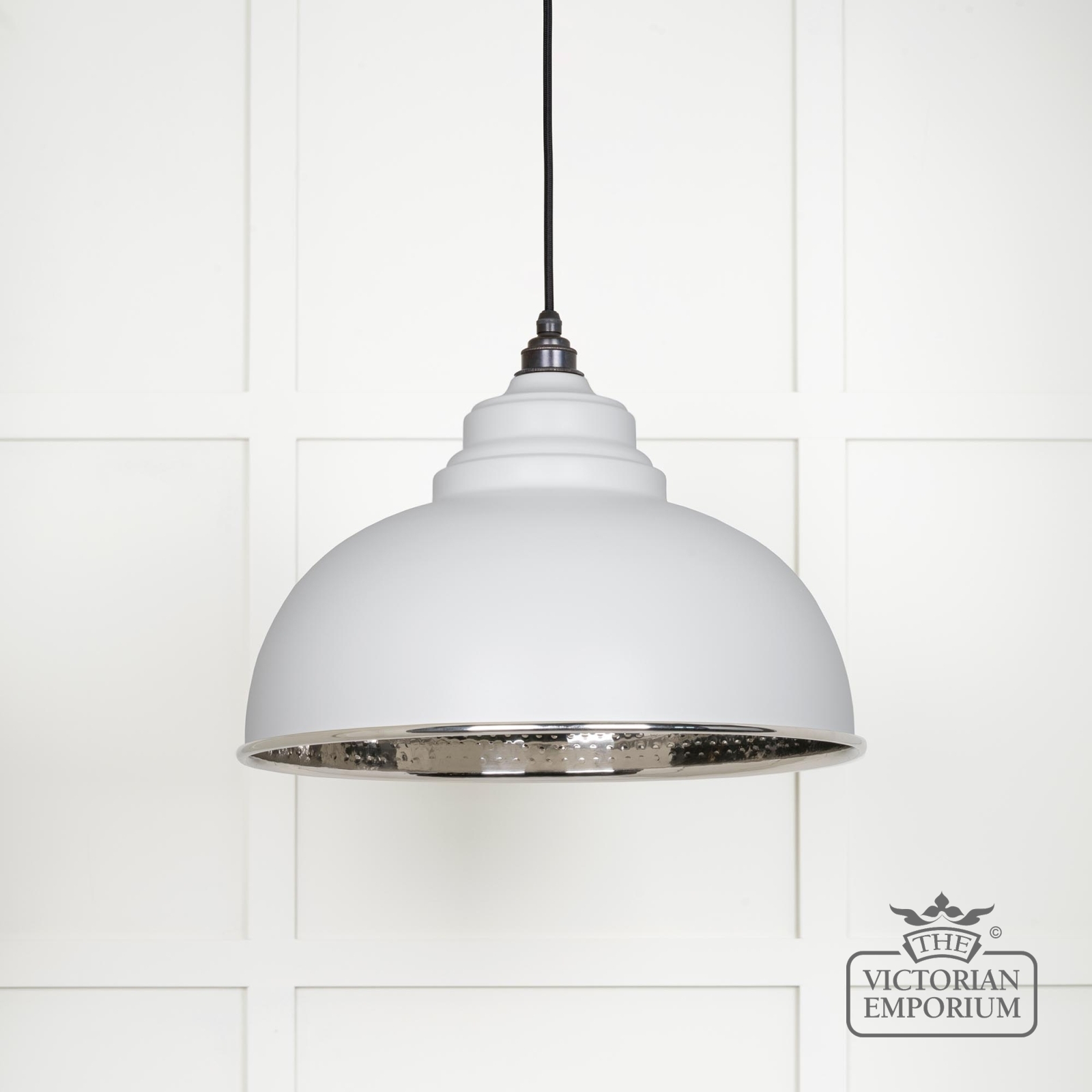 This pendant is hand spun from solid brass and finished in smooth nickel with a black fabric cable. This model has a hammered nickel interior and a painted flock exterior