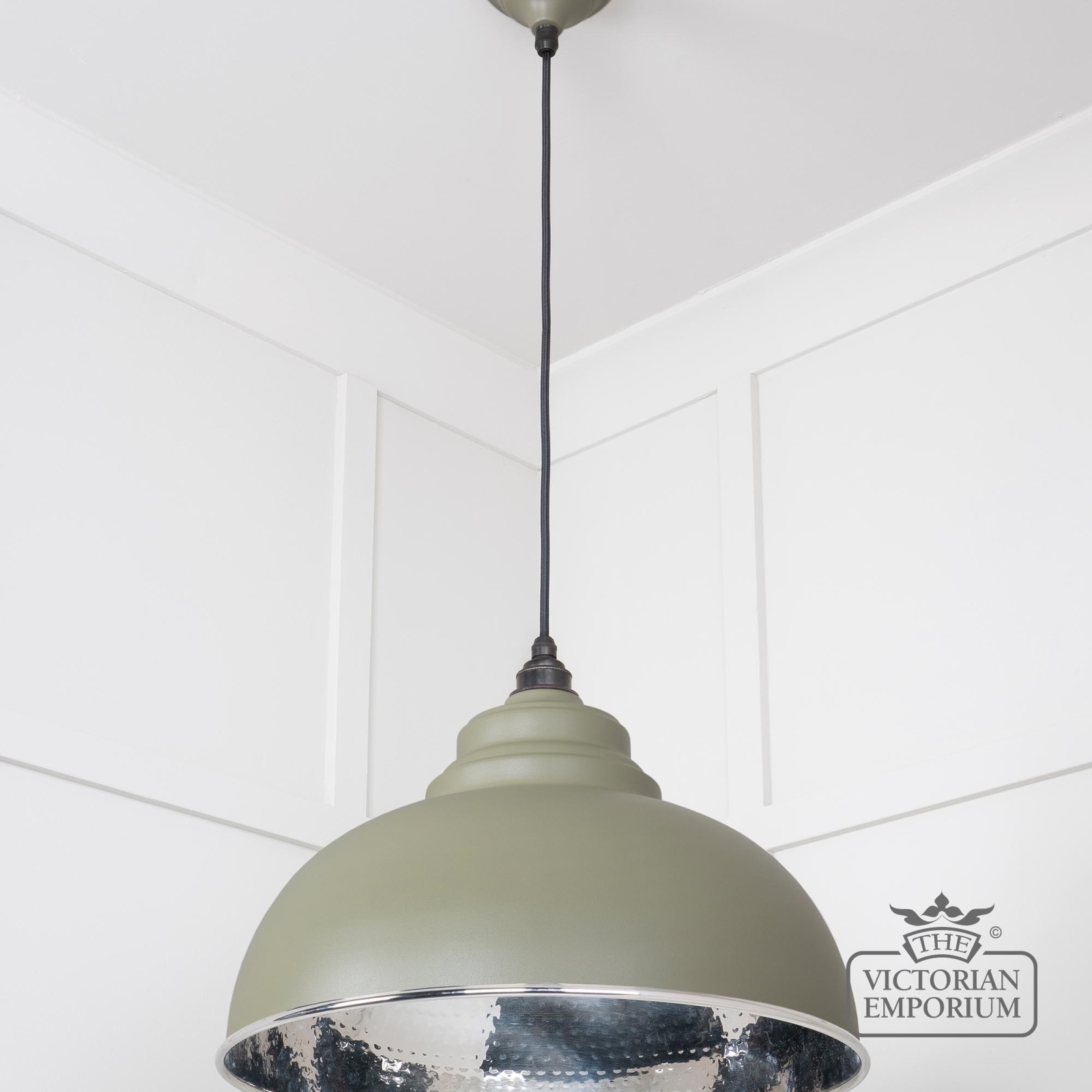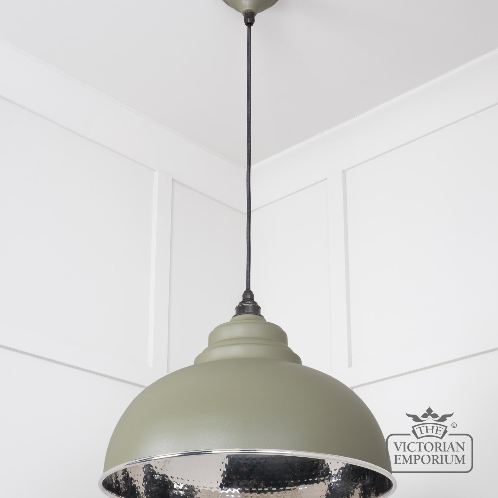 This pendant is hand spun from solid brass and finished in smooth nickel with a black fabric cable. This model has a hammered nickel interior and a painted tump exterior
