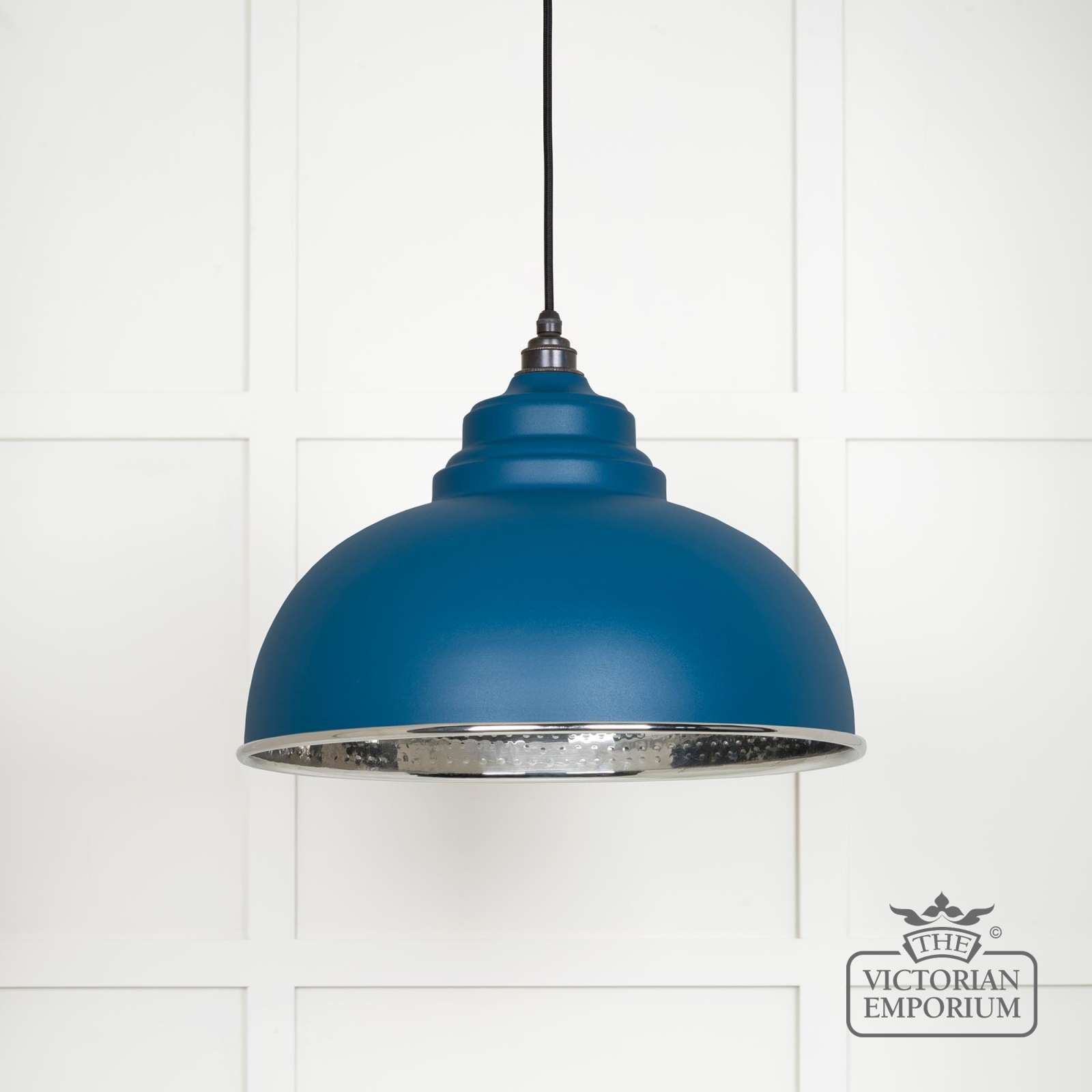 This pendant is hand spun from solid brass and finished in smooth nickel with a black fabric cable. This model has a hammered nickel interior and a painted upstream exterior
