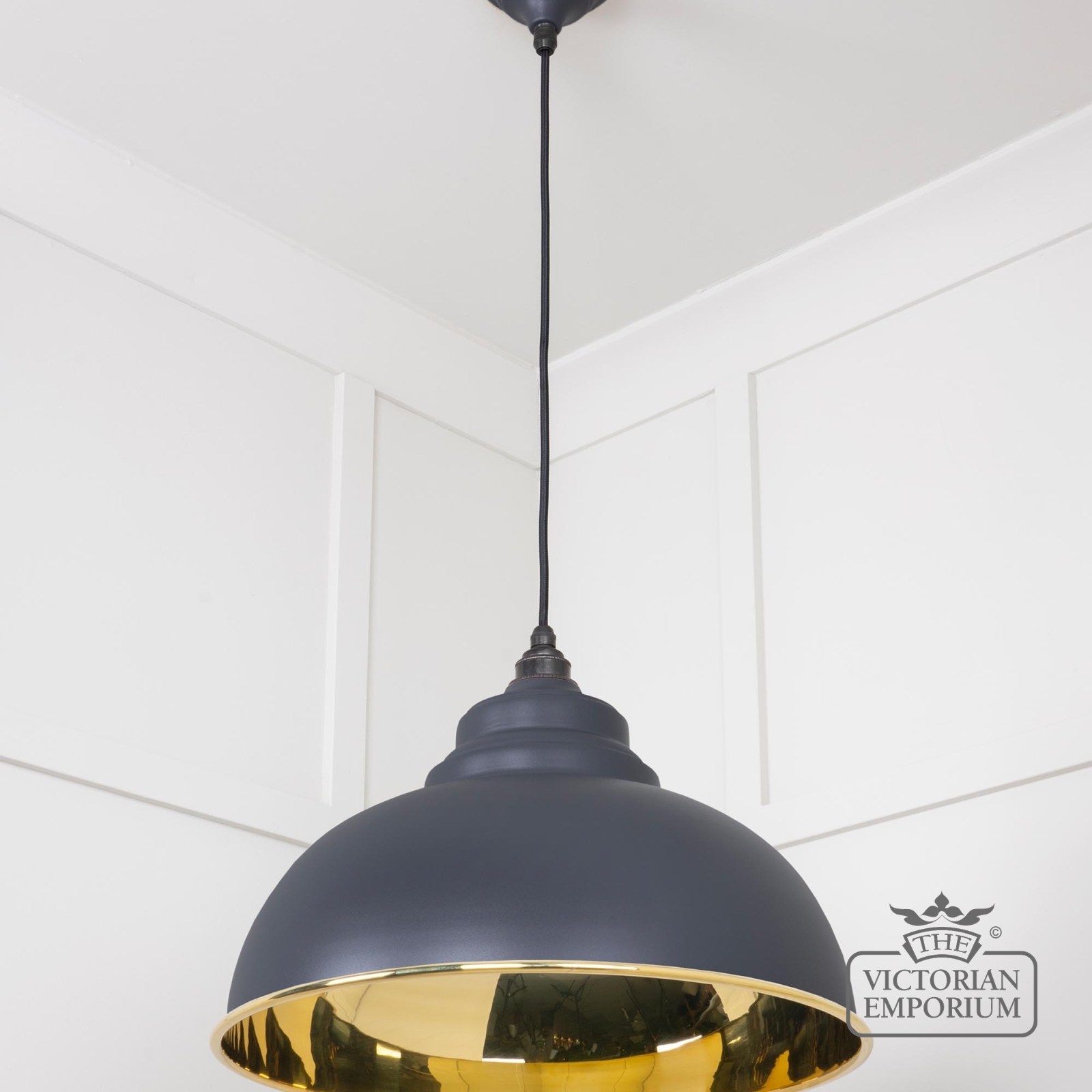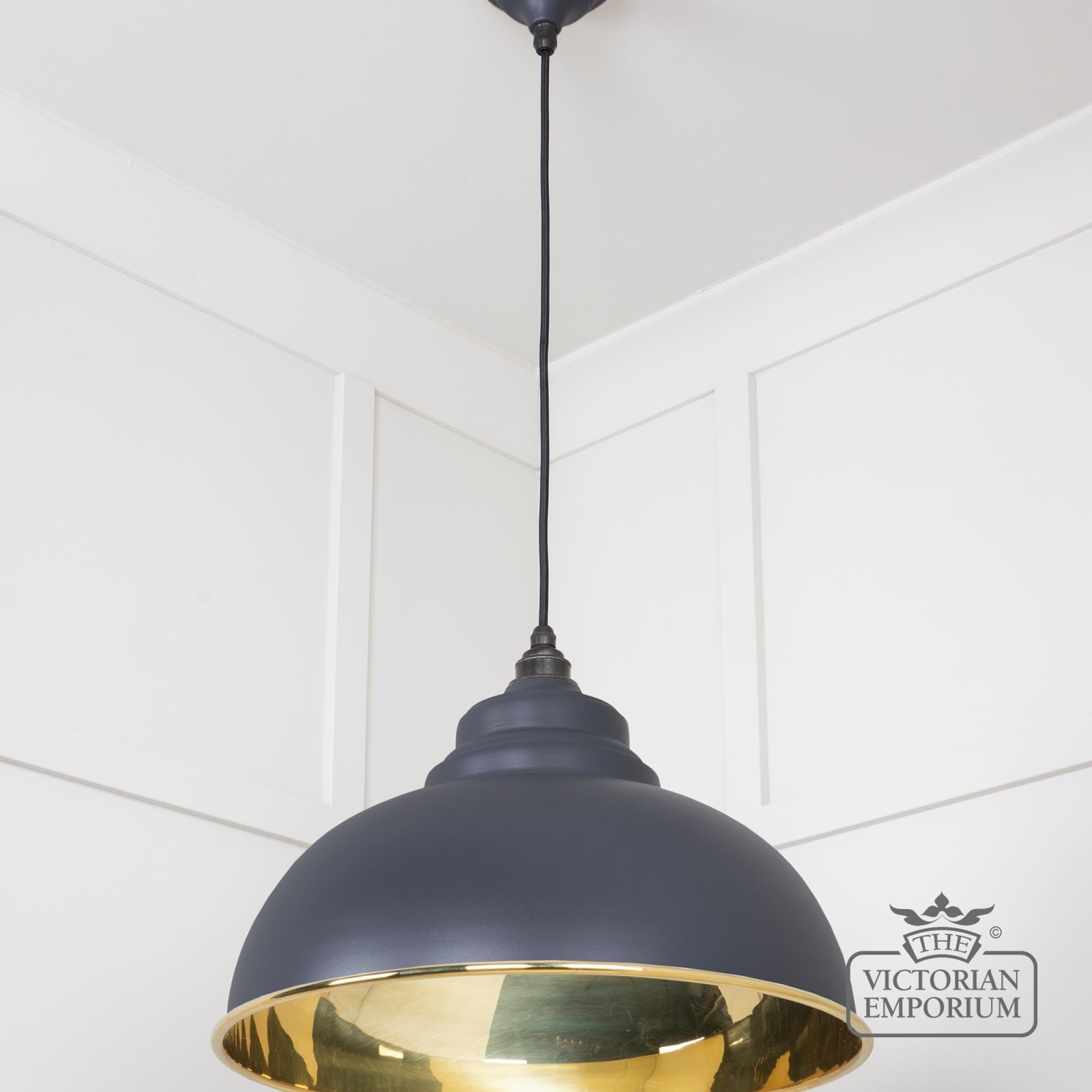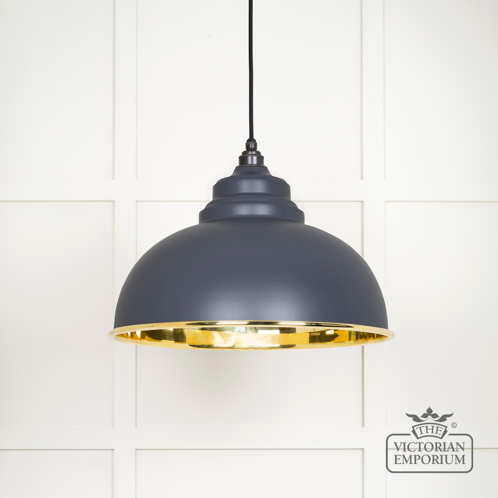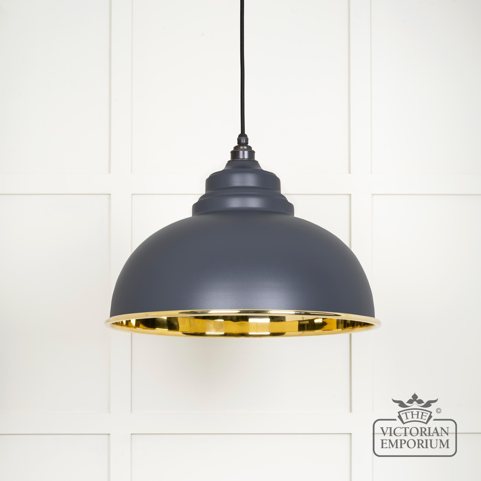 The Harlow pendant is a classic design with rounded edges and perfect proportions to make it the perfect focal point with a smooth brass interior and with painted Slate exterior