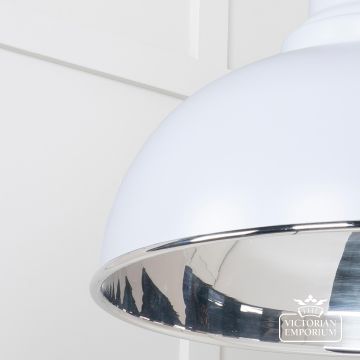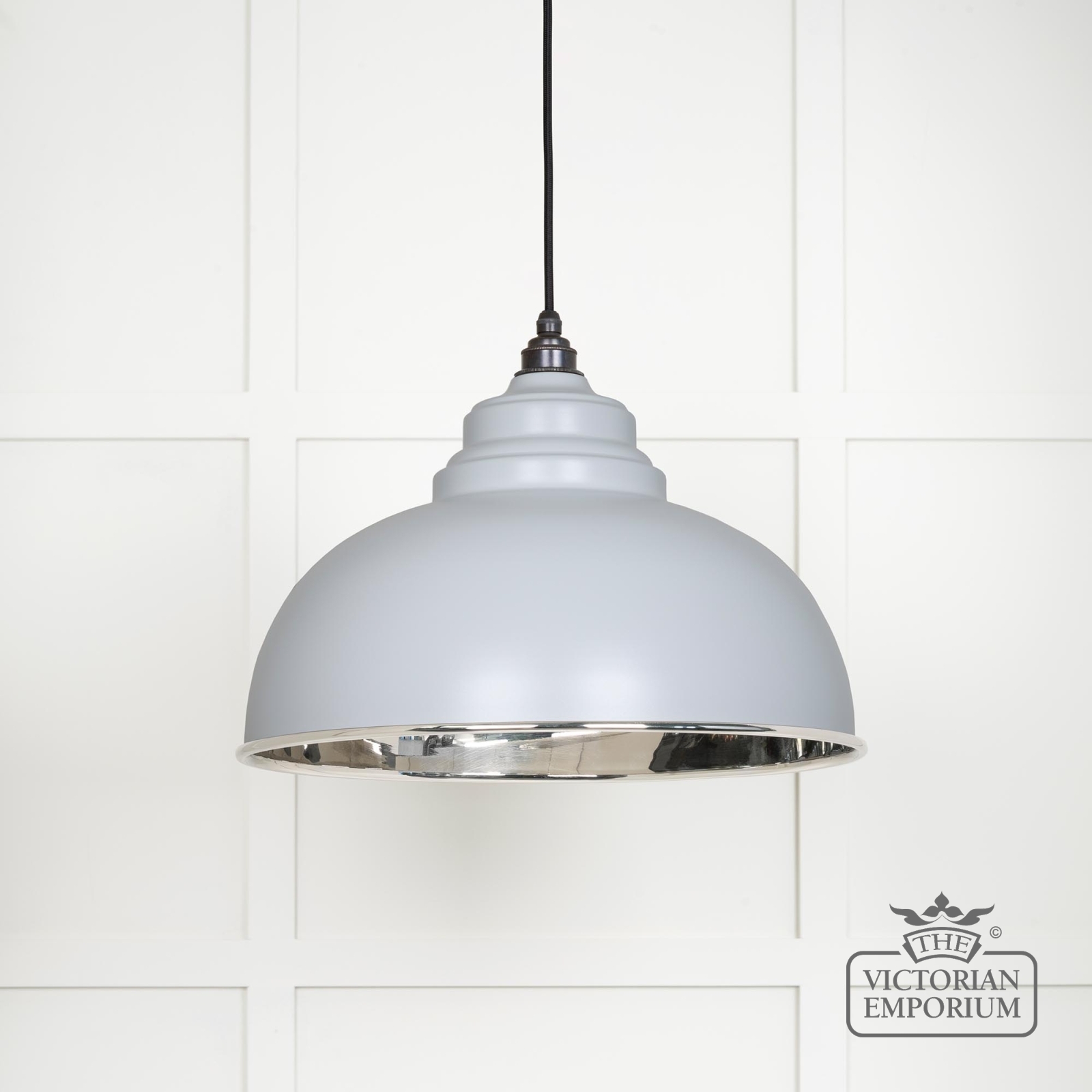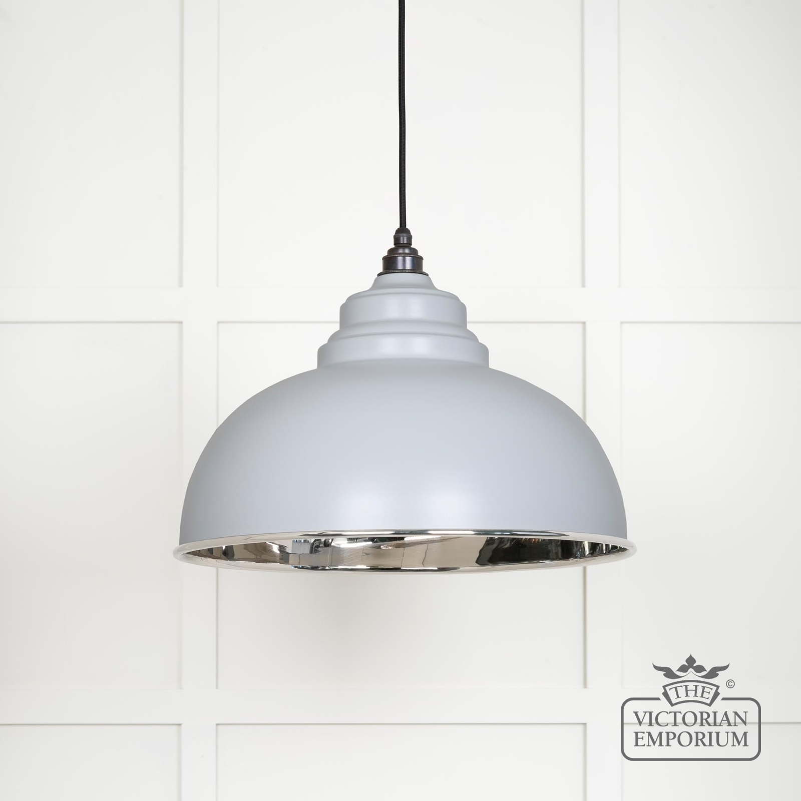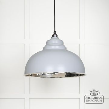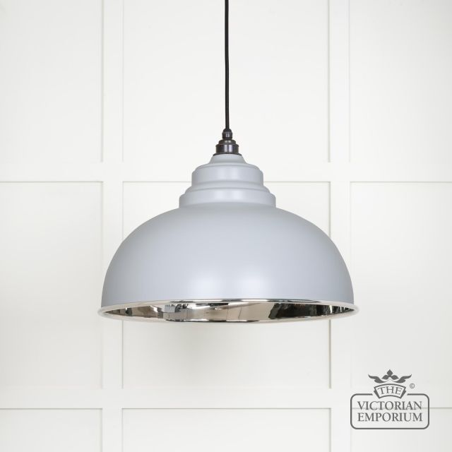 This pendant is hand spun from solid brass and finished in smooth nickel with a black fabric cable. This model has a smooth nickel interior and painted birch exterior