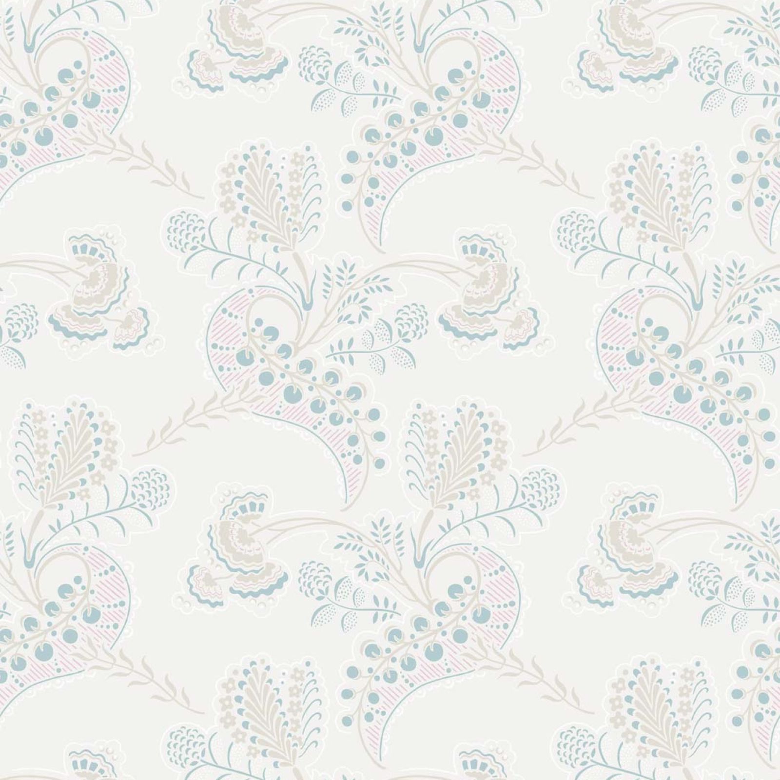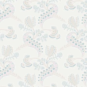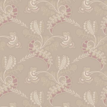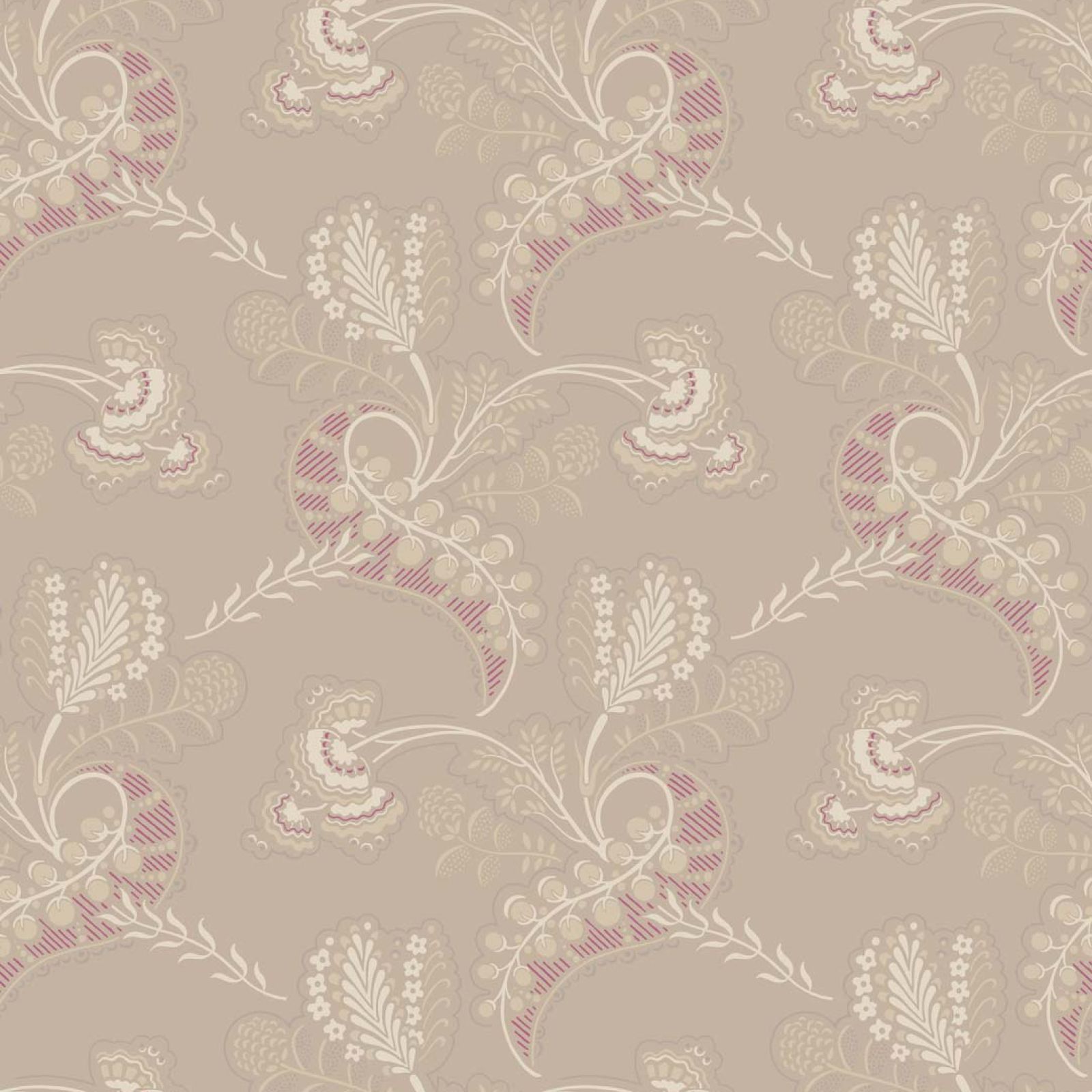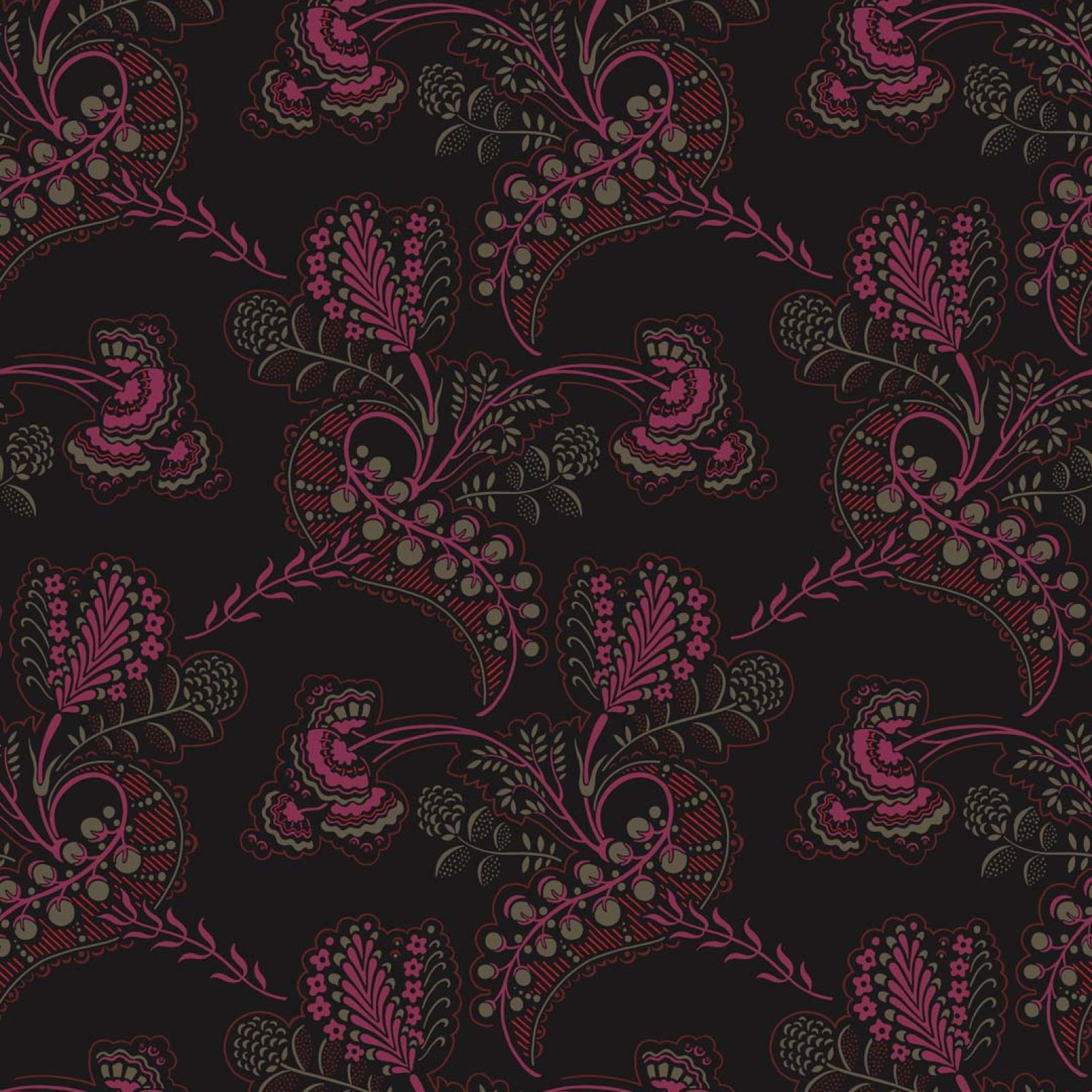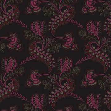 A four colour surface print wallpaper revealing weaving sprays of stylised flowers, in three colour-ways. Pink, orange, copper and grey on almost black, muted shades of biscuit, cream, pink and gunmetal grey on muted teal, taupe, tea rose and off white on dark cream.