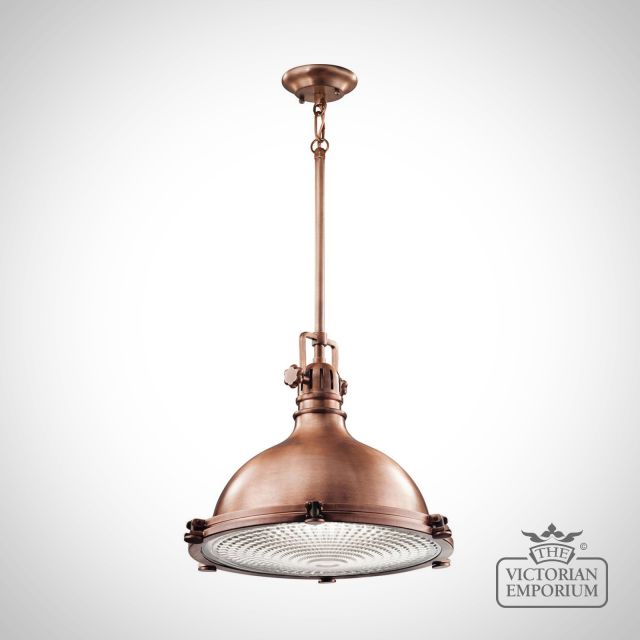 Distinctive light that features prismatic lens and industrial style. Available in Olde Bronze or Antique Copper finishes