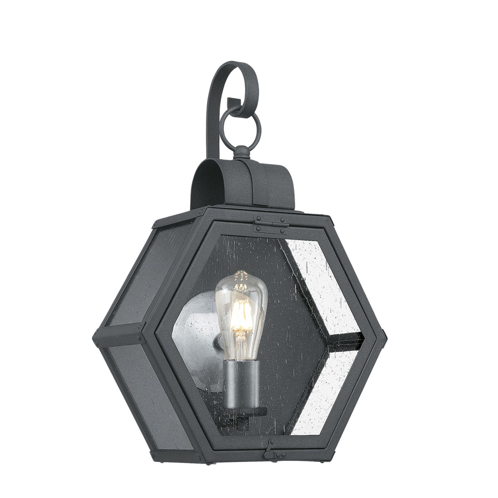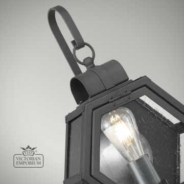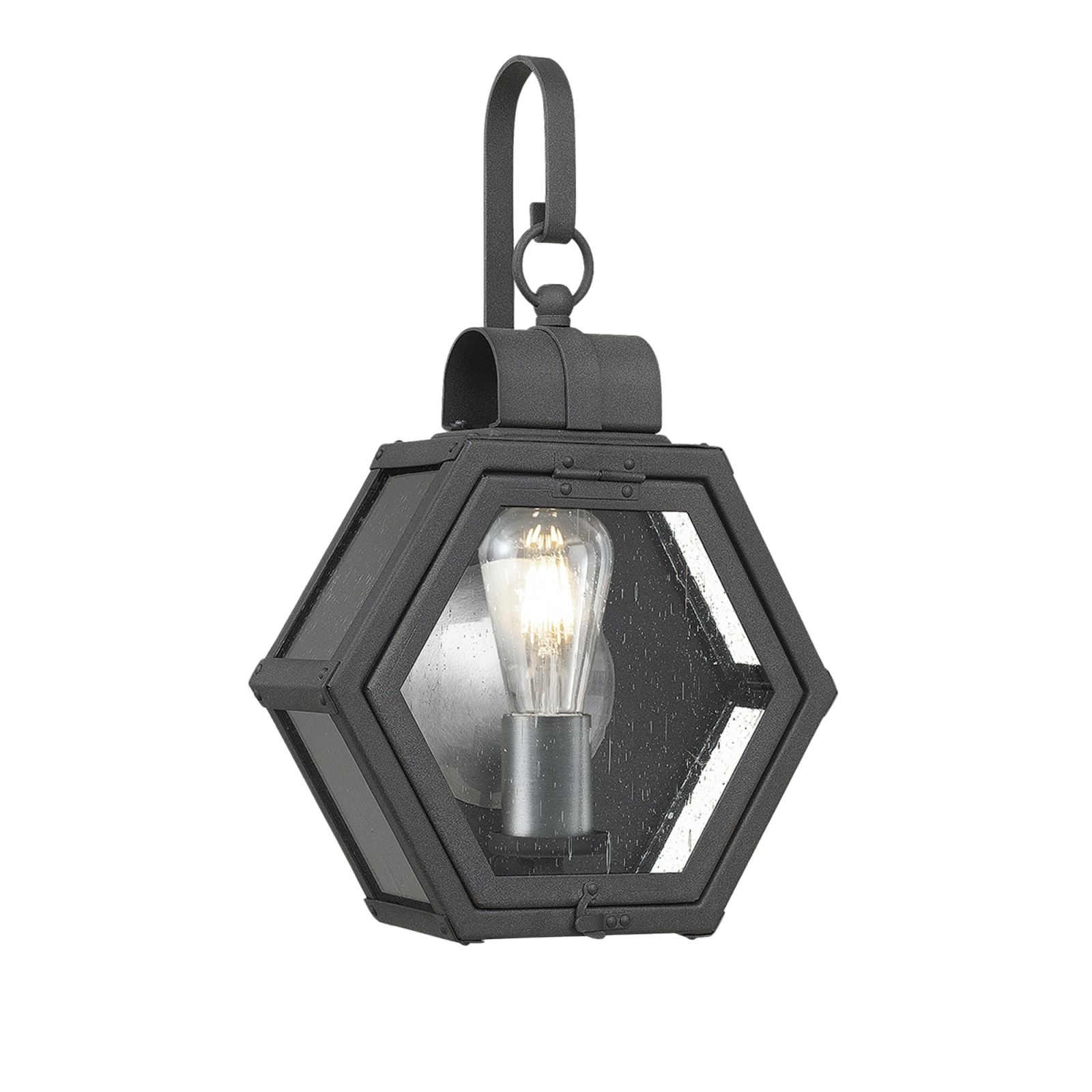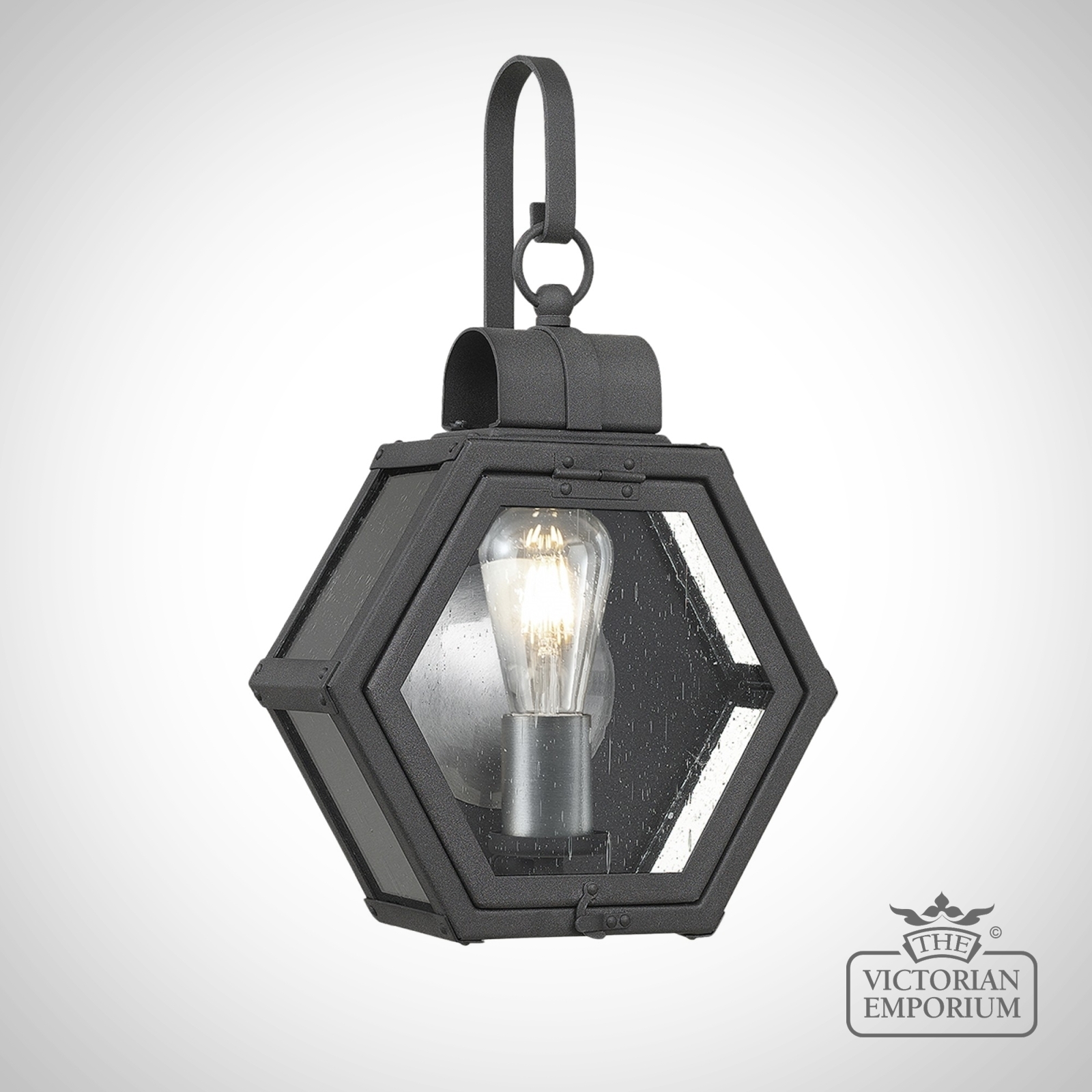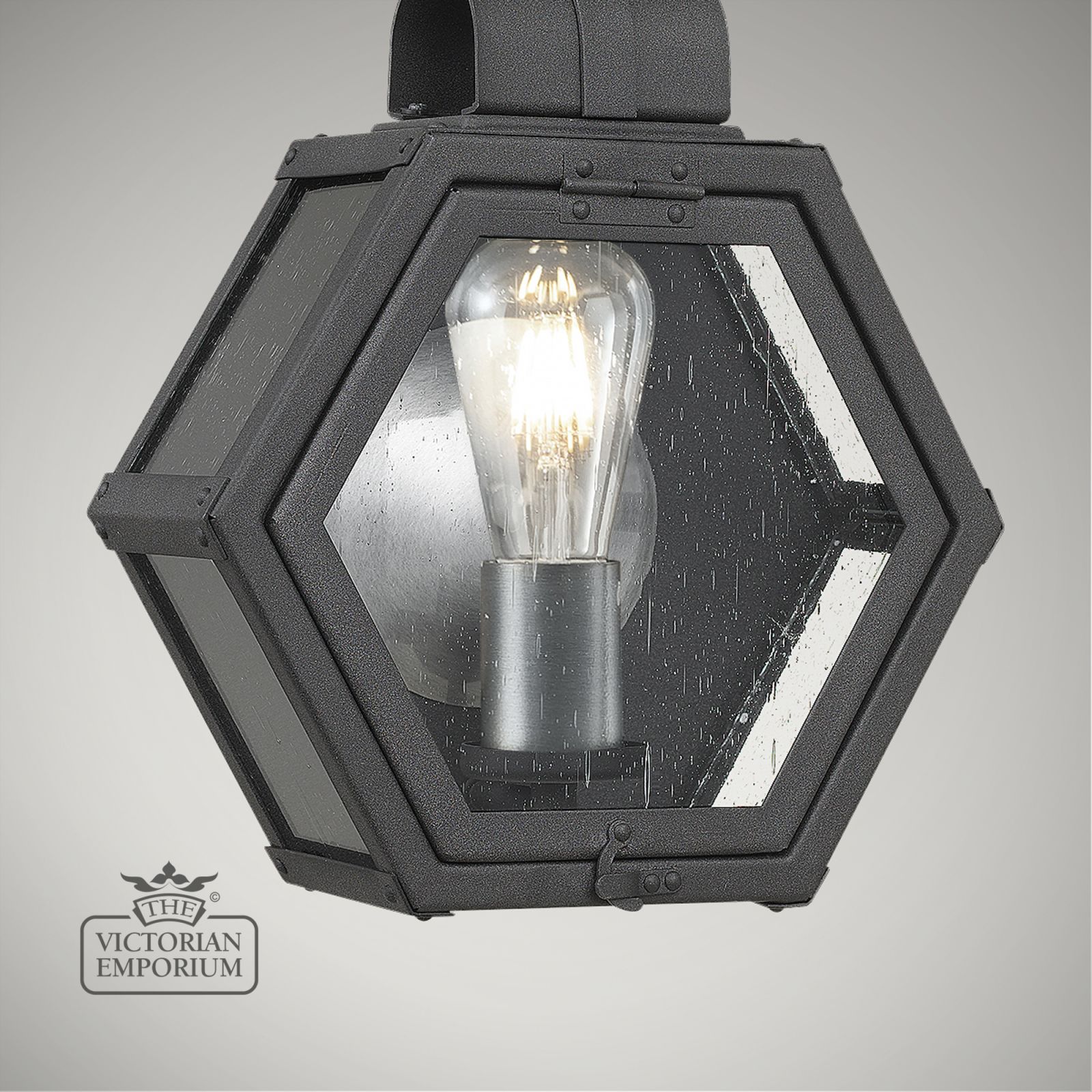 The Heath is a rustic hexagonal shape with a mottled black finish constructed from Aluminium, Brass, Steel and Clear Seeded Glass with a brushed silver reflector and candle holder