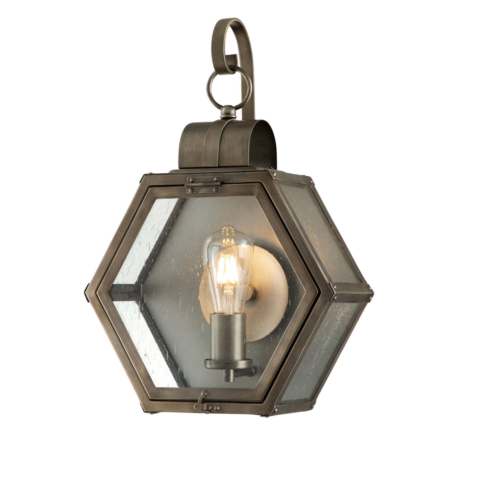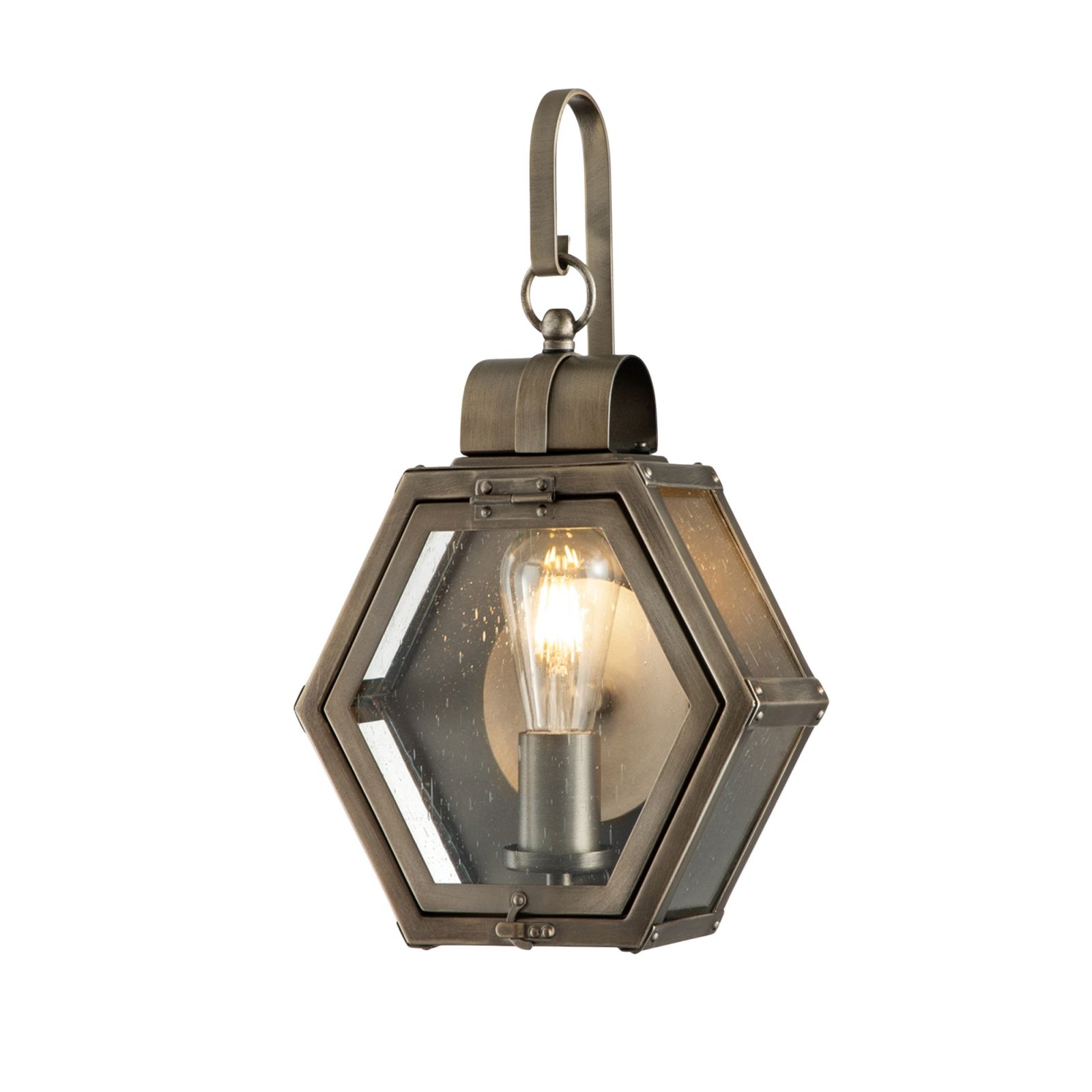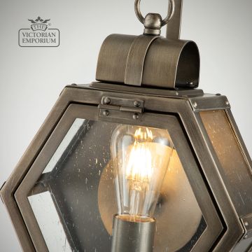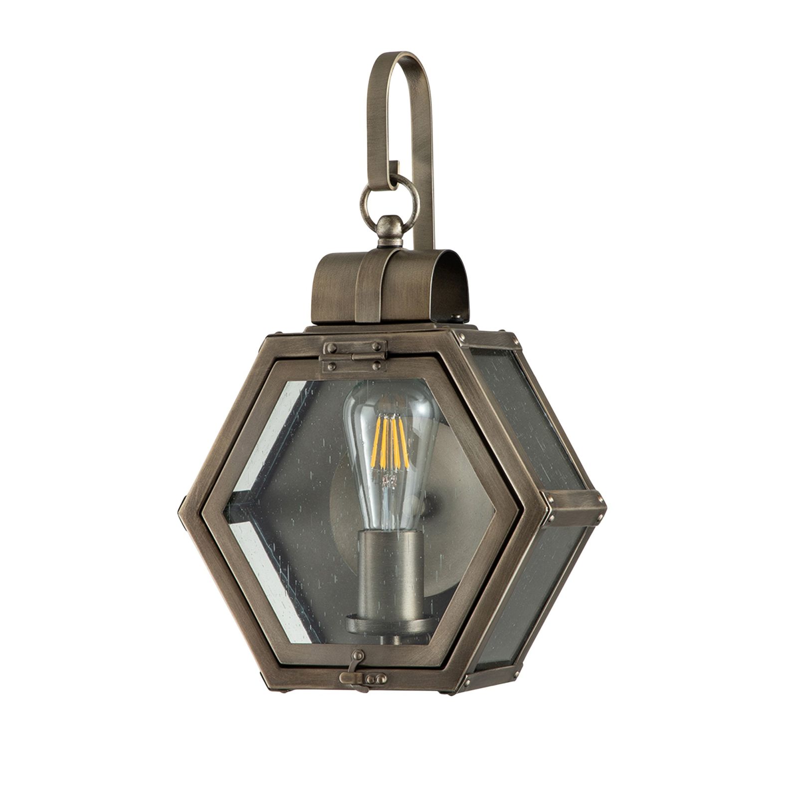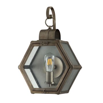 The Heath is a rustic hexagonal shape with a painted burnished bronze finish constructed from Aluminium, Brass, Steel and Clear Seeded Glass.