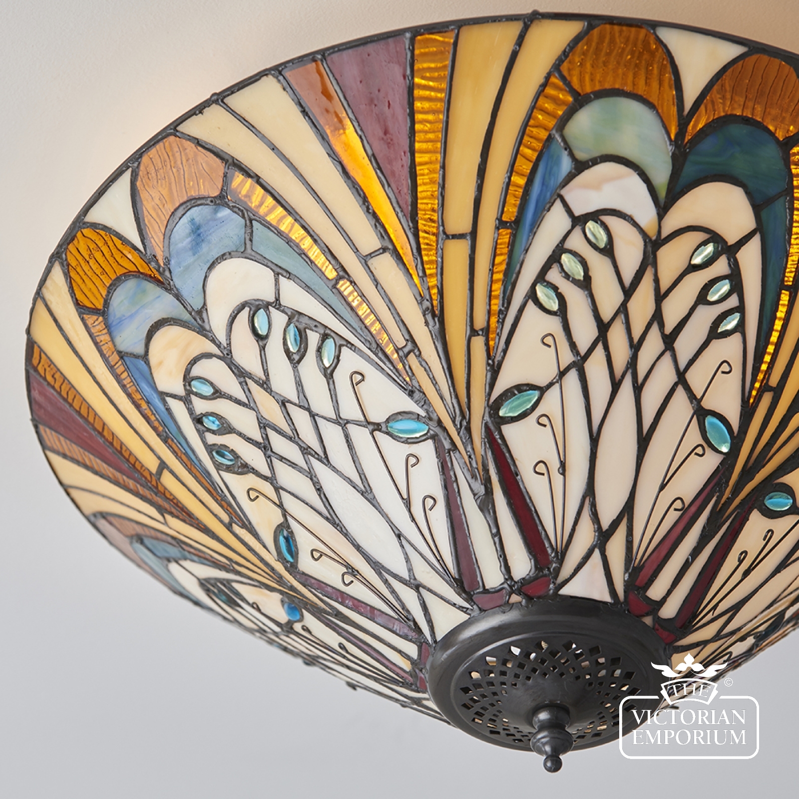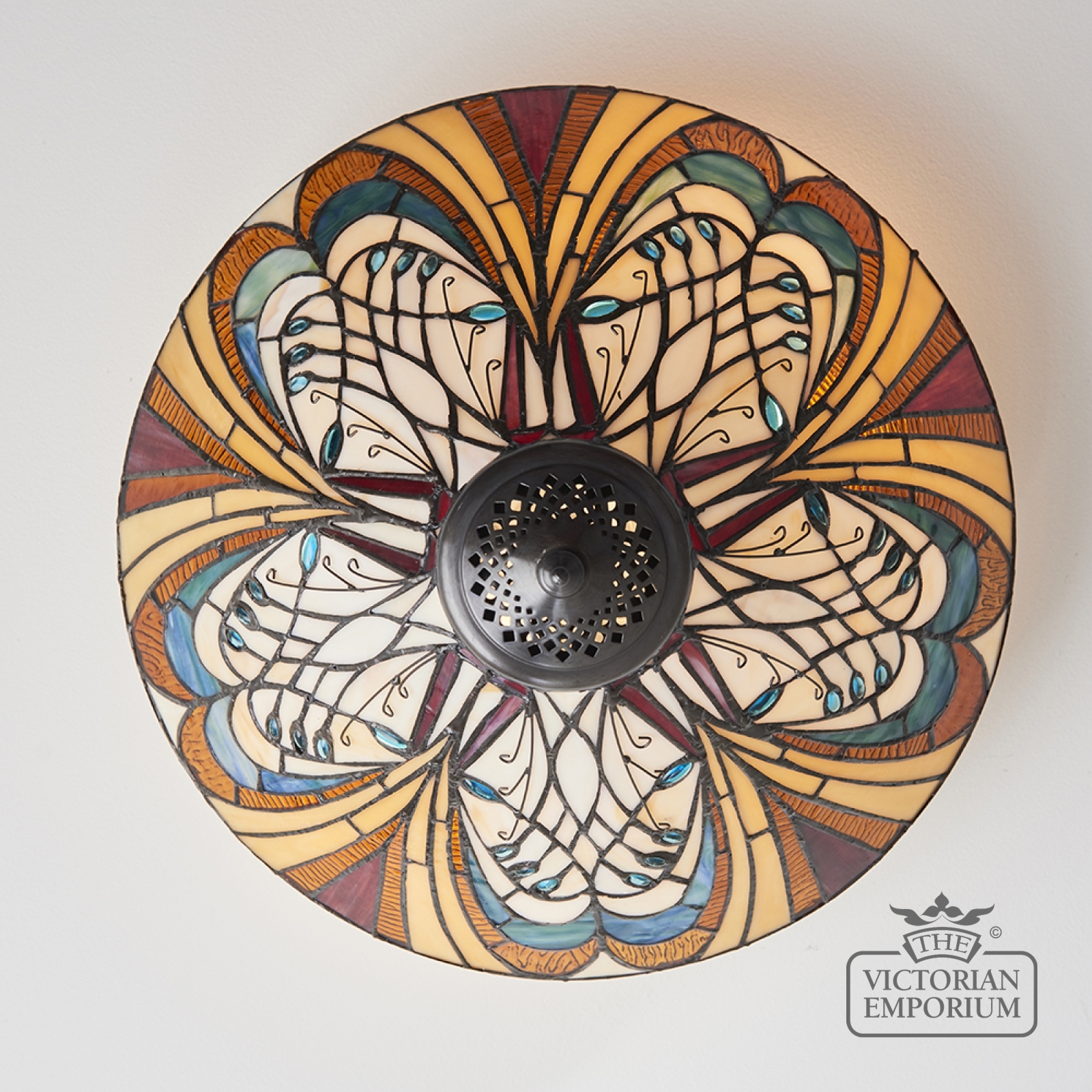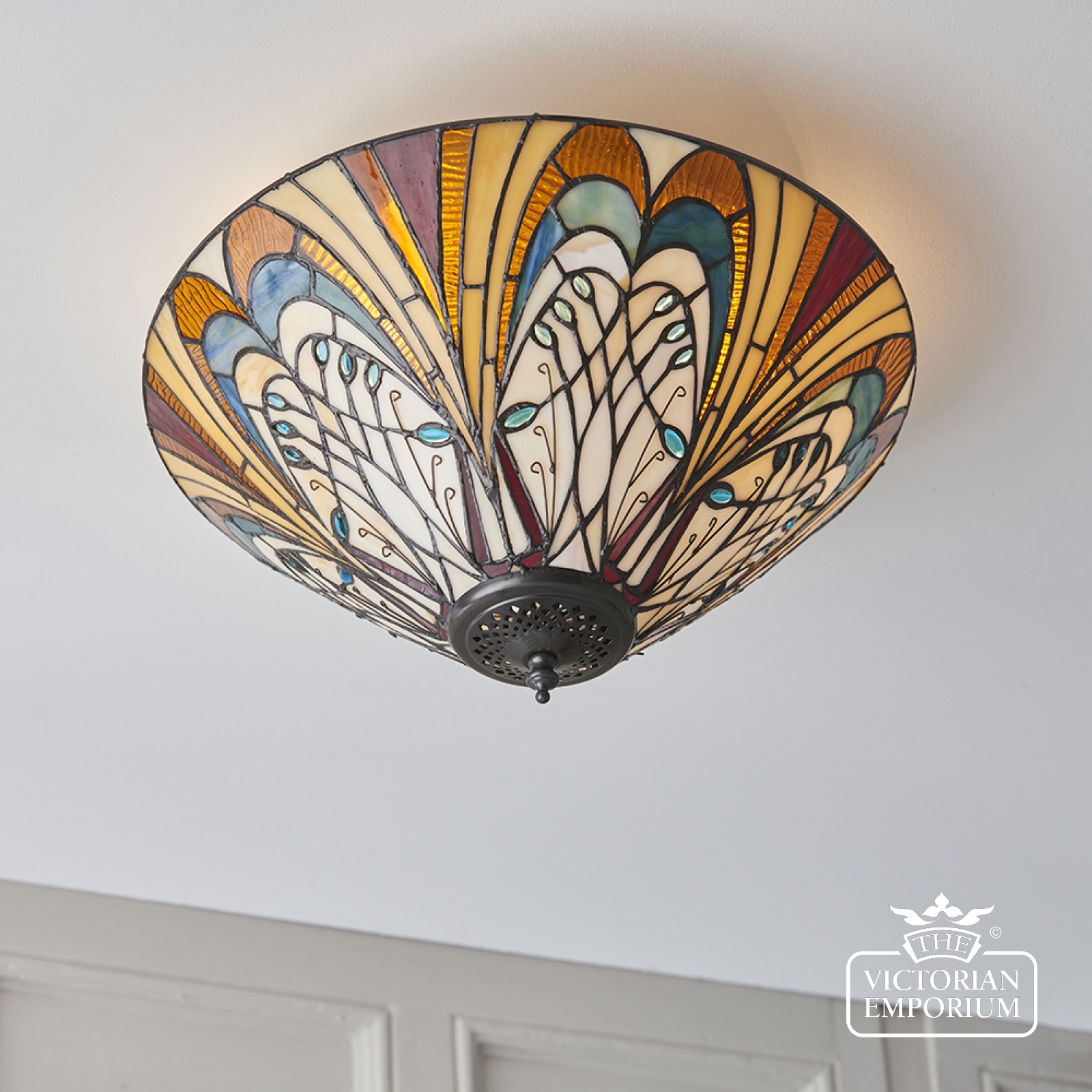 Tiffany style glass flush ceiling light teamed with a bronze effect fitting