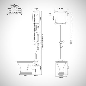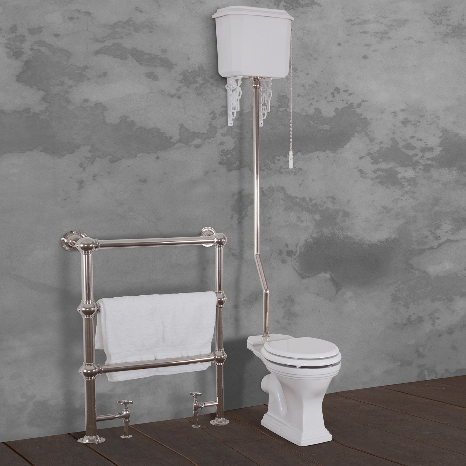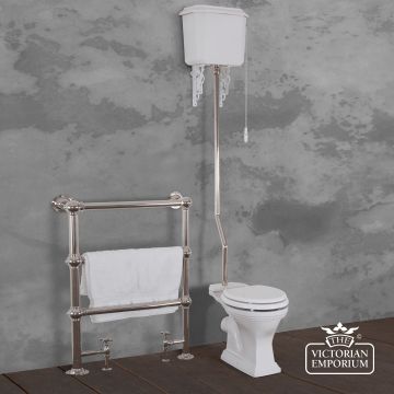 Classic High Level Toilet, a perfect choice for a Victorian style bathroom, with a choice of chrome, Nickel or Copper Flush Pipe Kit sets. Includes a pan, cistern, flush pipe kit, cistern lever and toilet seat.