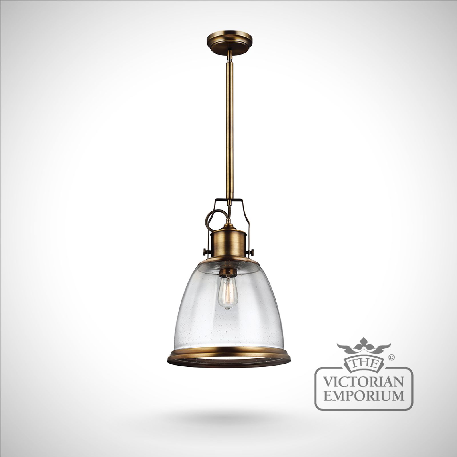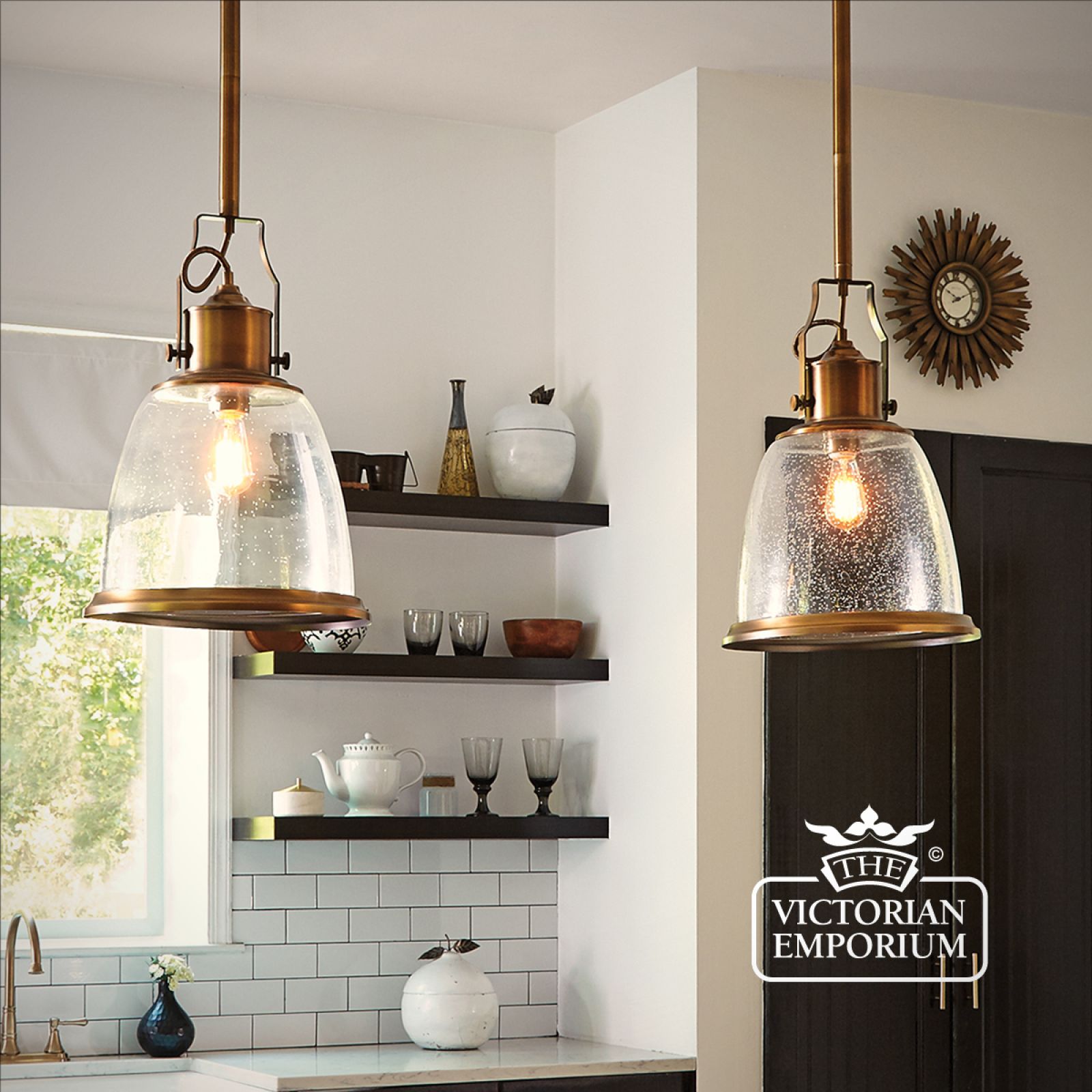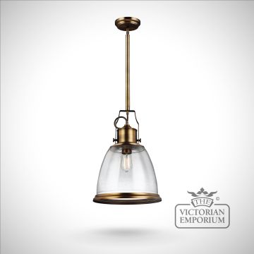 This is an industrial inspired pendant with a top pivot and seeded glass in a large size (also available as a medium size). This collection is available in aged brass and satin nickel