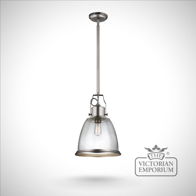 This is an industrial inspired pendant with a top pivot and seeded glass in a large size (also available as a medium size). This collection is available in aged brass and satin nickel