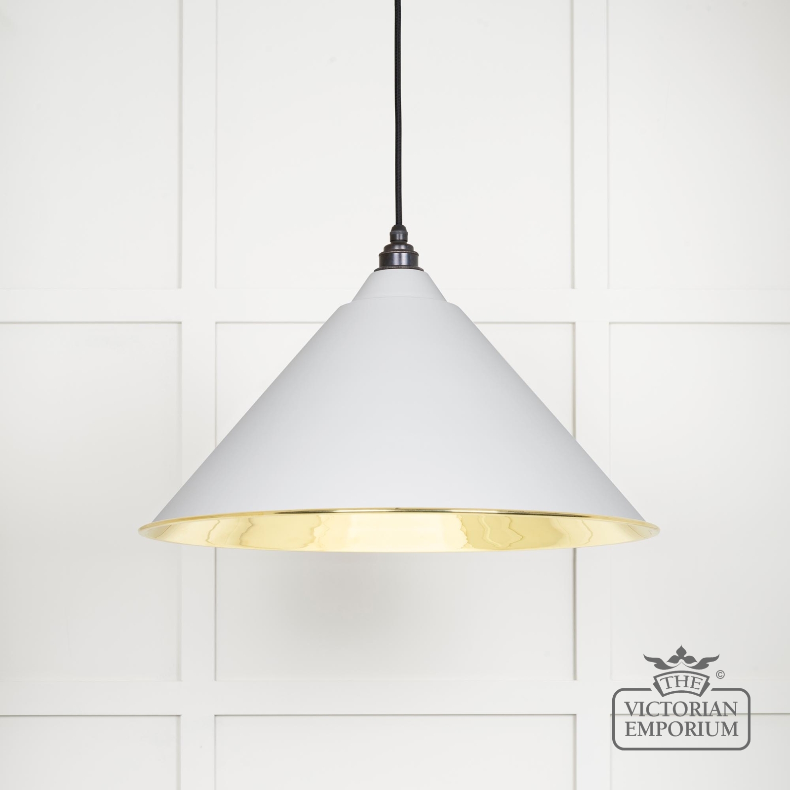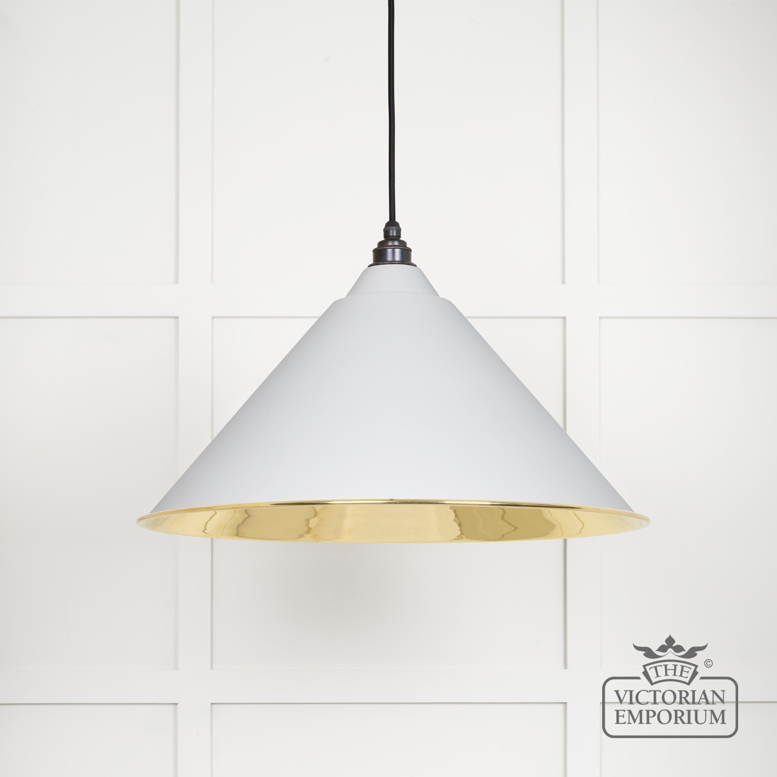 The Hockliffe’s large conical shape creates a more modern feel in traditional brass with a Flock exterior. It can be hung as a centrepiece or grouped to create a statement