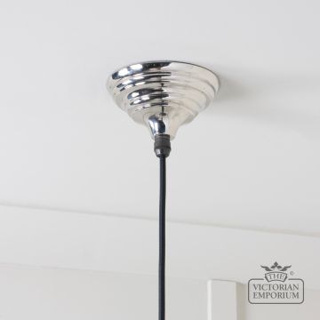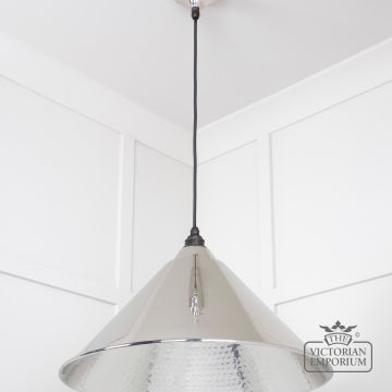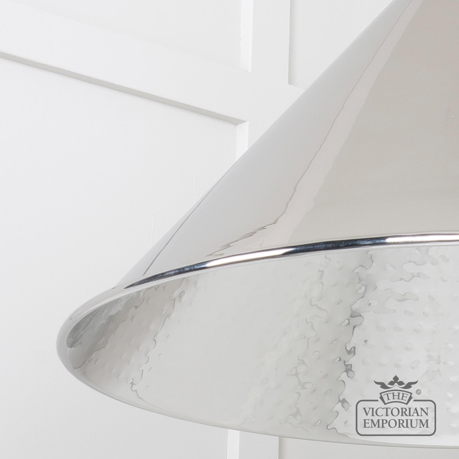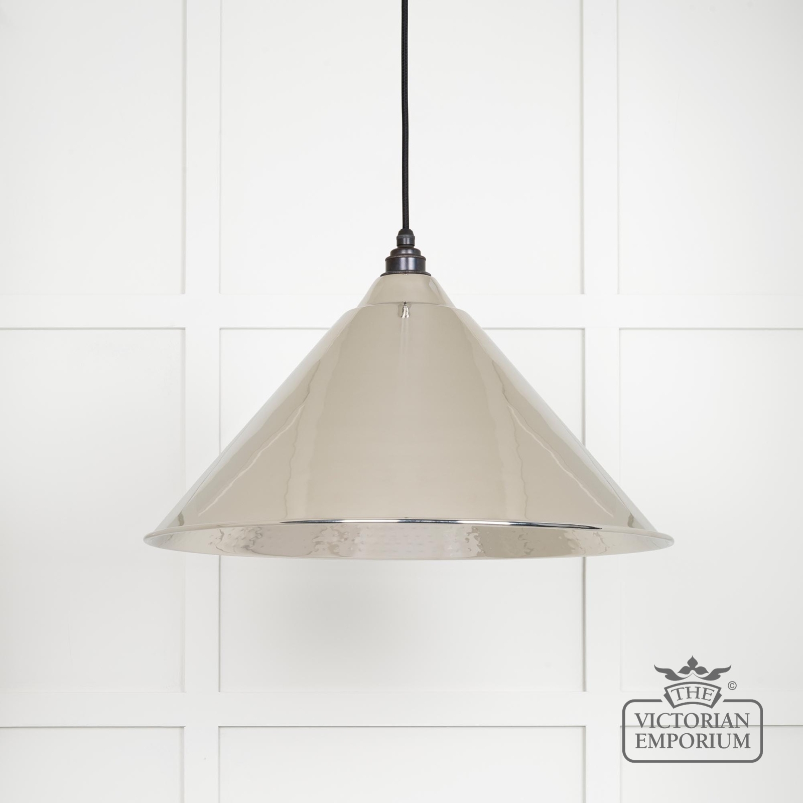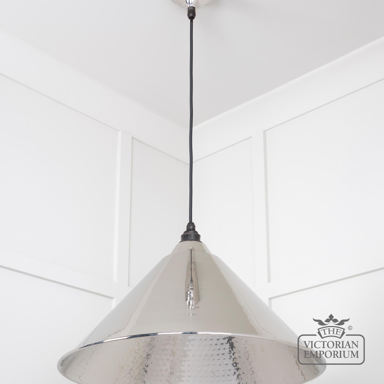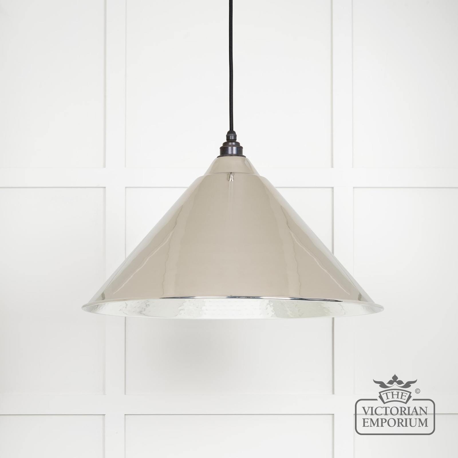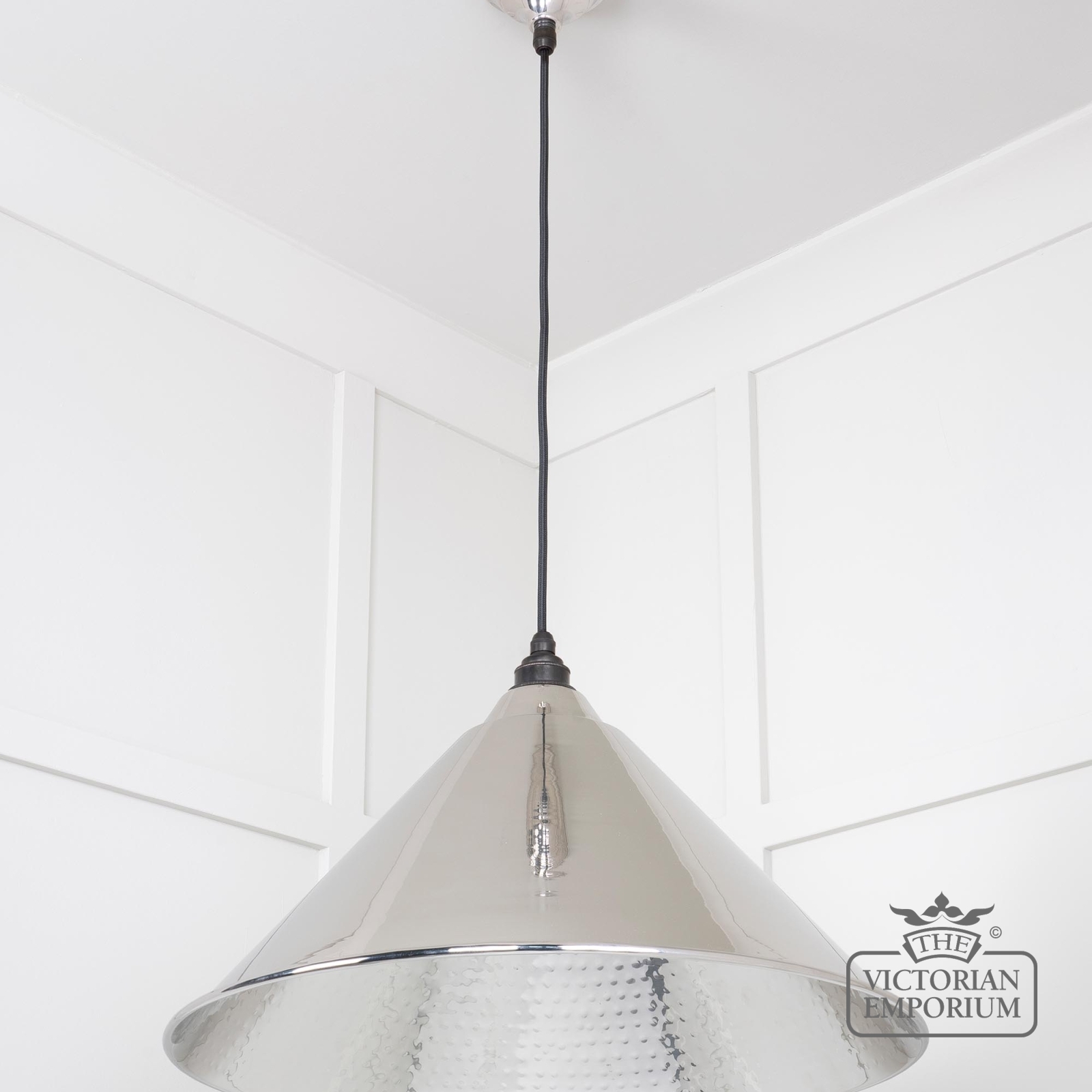 The Hockliffe’s conical shape creates a more modern feel in hammered nickel inside and out. It can be hung as a centrepiece or grouped to create a statement